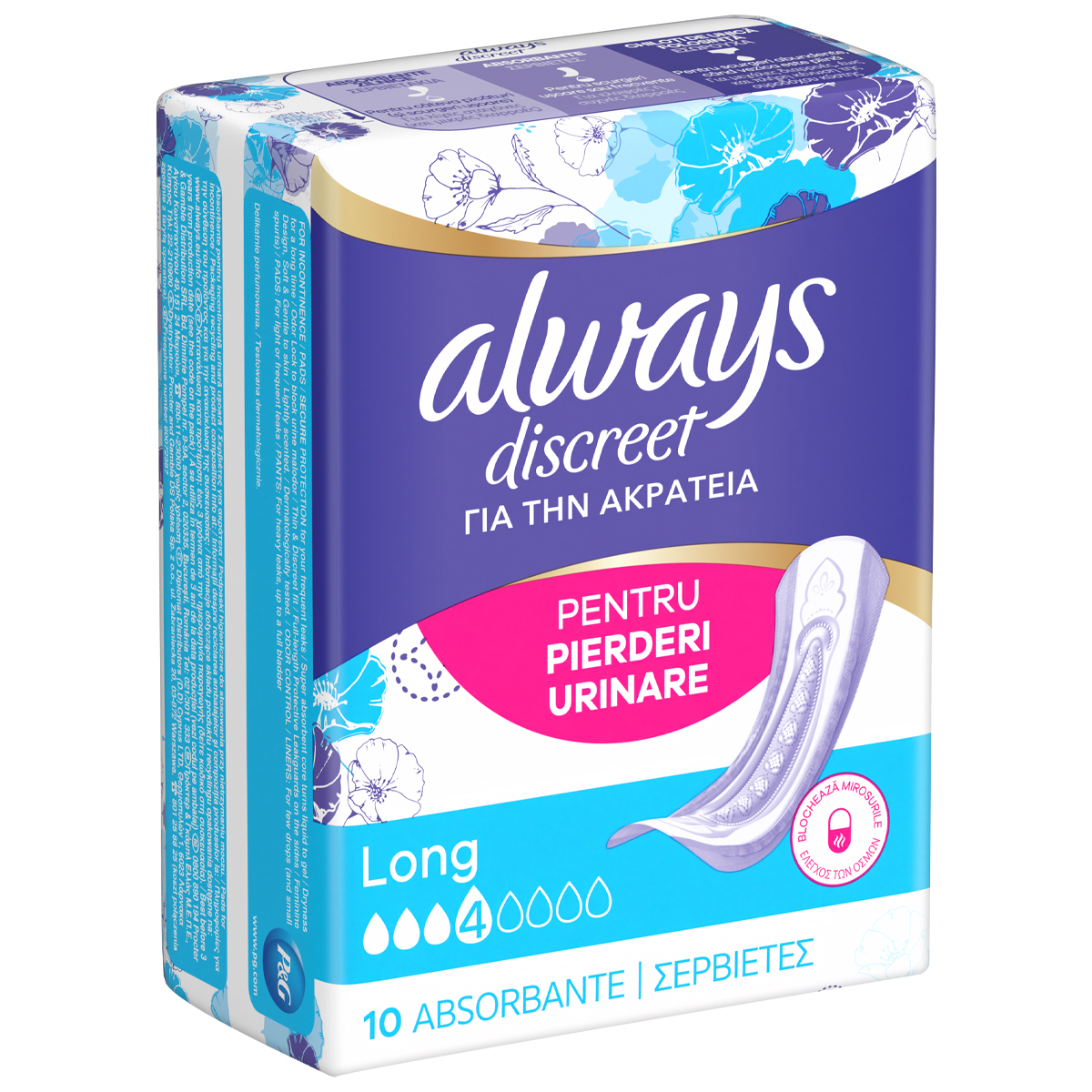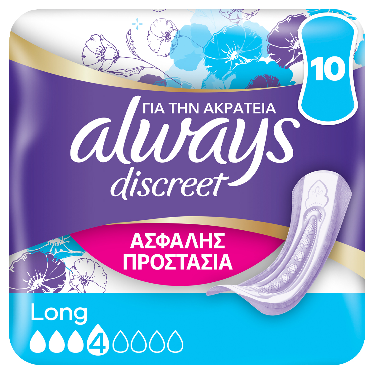 Ιδανικές για πιο έντονες ανάγκες. Οι Always Discreet Σερβιέτες Long για την Ακράτεια είναι εξαιρετικά ασφαλείς και σχεδόν δεν τις αισθάνεσθε. Έχουν σχεδιαστεί ώστε να σας προσφέρουν επιπλέον κάλυψη και προστασία ώστε να πάψετε να ανησυχείτε για διαρροές. Η μοναδική τους δομή προσφέρει ισχυρή προστασία με πολύ λεπτό πυρήνα ώστε να μην έχετε να επιλέξετε μεταξύ της άνεσης και της προστασίας. Αν το φτέρνισμα ή το γέλιο σας προκαλεί διαρροές ουροδόχου κύστης, οι σερβιέτες Always Discreet Plus Long σας προσφέρουν ιδανική προστασία.