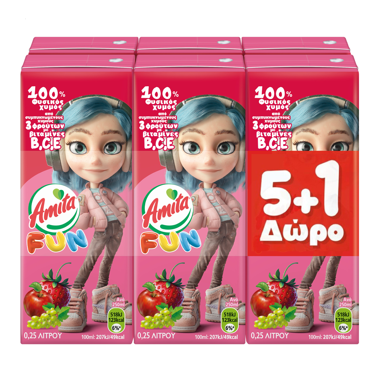 Amita Fun Φρουτοποτό Φράουλα Σταφύλι Μήλο 5 x 250 ml + 1 x 250 ml Δώρο