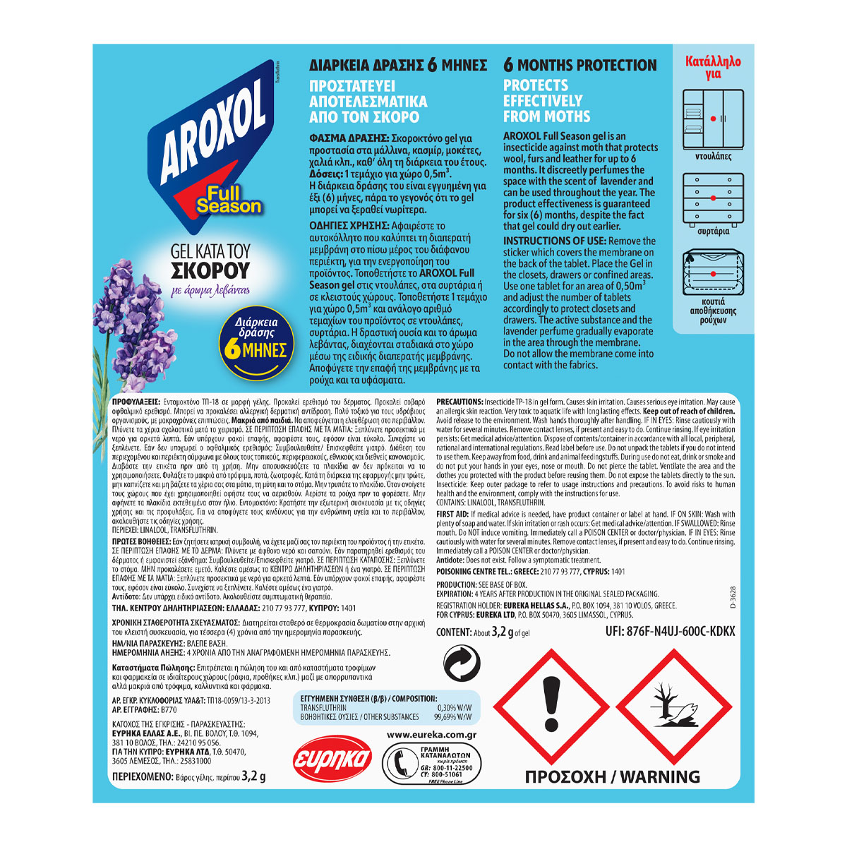 Αφαιρέστε το αυτοκόλλητο που καλύπτει τη διαπερατή μεμβράνη στο πίσω μέρος του διάφανου περιέκτη. για την ενεργοποίηση του προϊόντος. Τοποθετήστε το στις ντουλάπες, στα συρτάρια ή σε κλείστούς χώρους. Η δραστική ουσία και το άρωμα λεβάντας διαχέονται σταδιακά στο χώρο μέσω της ειδικής μεμβράνης. Αποφεύγετε την επαφή της μεμβράνης με τα ρούχα και τα υφάσματα.