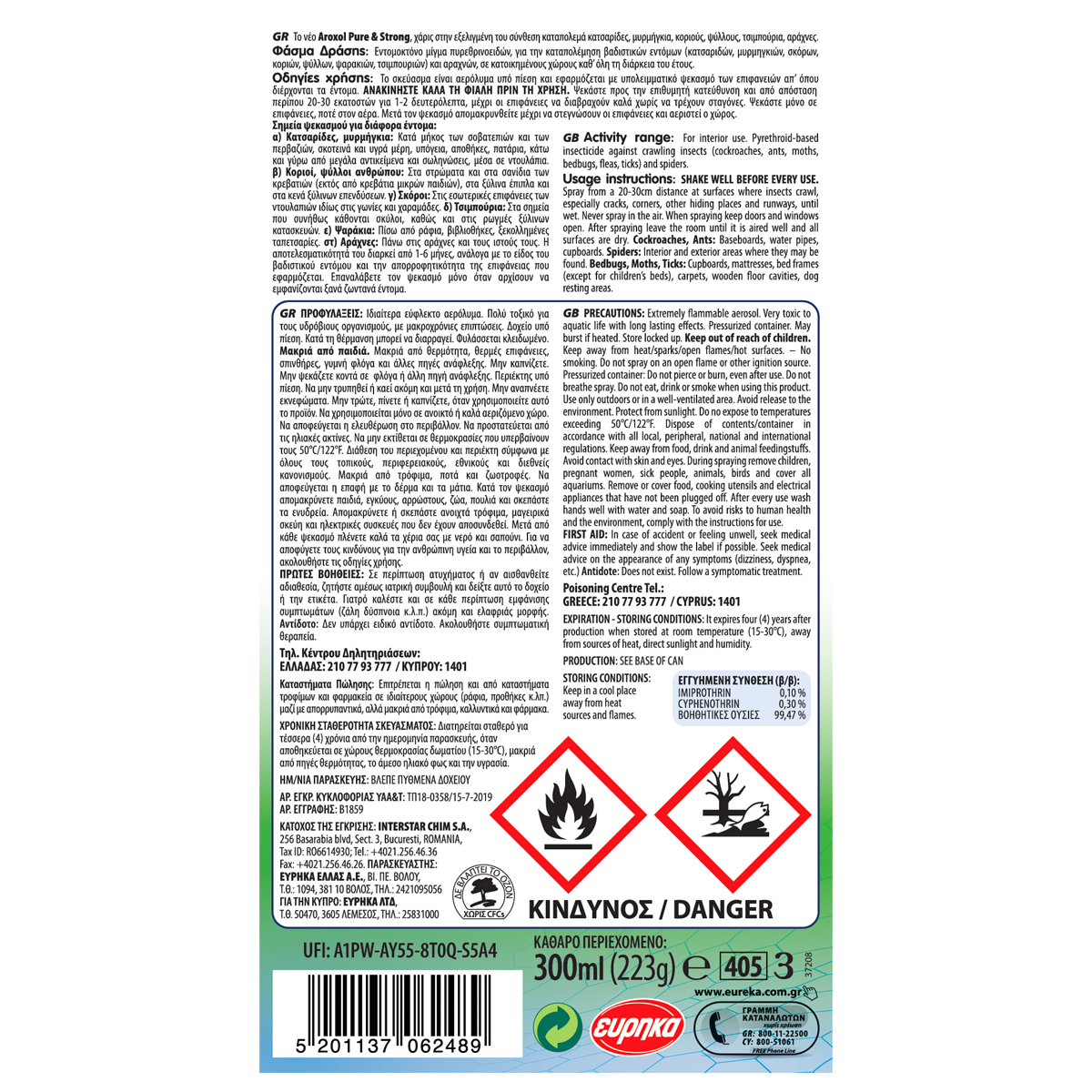 Ιδιαίτερα εύφλεκτο αερόλυμα. Πολύ τοξικό για τους υδρόβιους οργανισμούς, με μακροχρόνιες επιπτώσεις. Δοχείο υπό πίεση. Κατά τη θέρμανση μπορεί να διαρραγεί. Φυλάσσεται κλειδωμένο. Μακριά από παιδιά. Μακριά από θερμότητα, θερμές επιφάνειες σπινθήρες, γυμνή φλόγα και άλλες πηγές ανάφλεξης. Περιέκτης υπό πίεση. Να μην τρυπηθεί ή καεί ακόμη και μετά την χρήση. Μην αναπνέετε εκνεφώματα. Μην τρώτε, πίνετε ή καπνίζετε, όταν χρησιμοποιείτε αυτό το προϊόν. Να χρησιμοποιείτε μόνο σε ανοικτό ή καλά αεριζόμενο χώρο. Να αποφεύγεται η ελευθέρωση στο περιβάλλον. Να προστατεύεται από τις ηλιακές ακτίνες. Ναμην εκτίθεται σε θερμολρασίες που υπερβαίνουν τους 50°C/122°F. Διάθεση του περιεχομένου και περιέκτη σύμφωνα με όλους τους τοπικούς, περιφερειακούς, εθνικούς και διεθνείς κανονισμούς. Μακριά από τρόφιμα, ποτά και ζωοτροφές. Να αποφεύγεται η επαφή με το δέρμα και τα μάτια. Κατα τον ψεκασμό απομακρύνετε παιδιά, εγκύους, αρρώστους, ζώα, πουλιά και σκεπάστε τα ενυδρεία. Απομακρύνετε ή σκεπάστε ανοιχτά τ