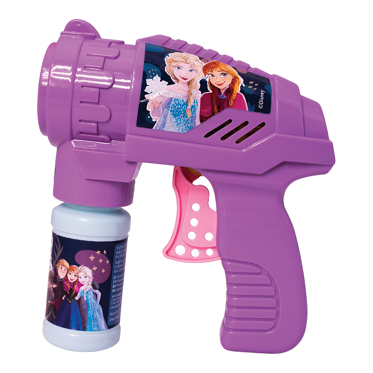 Όπλο μπουρμπουλήθρες Disney Frozen για να κάνεις αμέτρητες φούσκες! Βάλε το μπουκαλάκι στην υποδοχή του όπλου, πάτα τη σκανδάλη και κάνε χιλιάδες φούσκες! Λειτουργεί χωρίς μπαταρίες. Το μπουκαλάκι έχει χωρητικότητα 56ml.