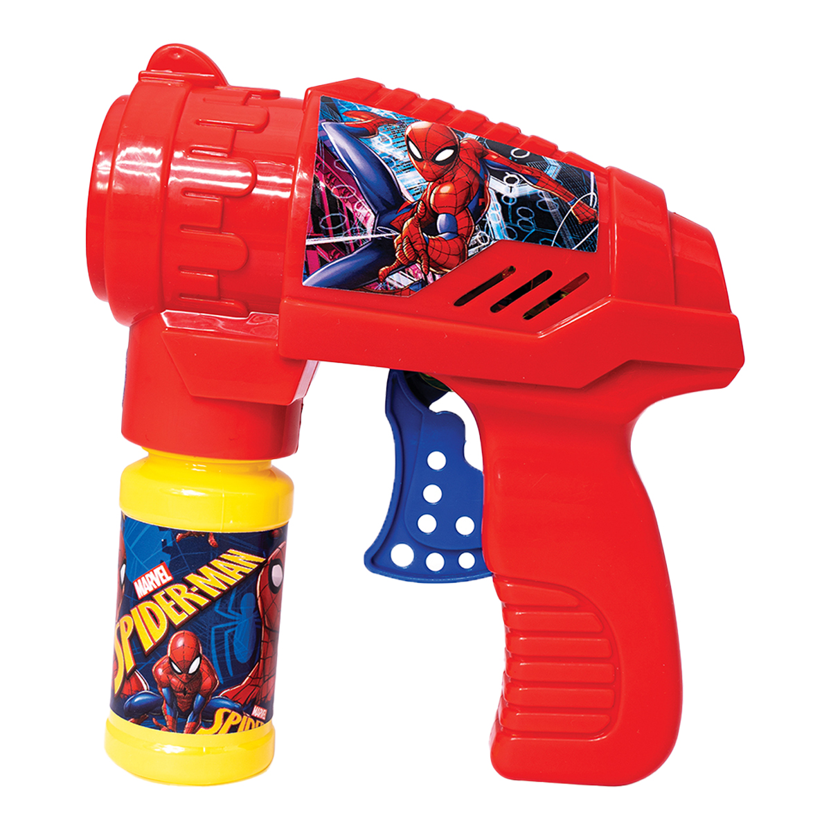 Όπλο μπουρμπουλήθρες Marvel Spiderman για να κάνεις αμέτρητες φούσκες! Βάλε το μπουκαλάκι στην υποδοχή του όπλου, πάτα τη σκανδάλη και κάνε χιλιάδες φούσκες! Λειτουργεί χωρίς μπαταρίες. Το μπουκαλάκι έχει χωρητικότητα 56ml.