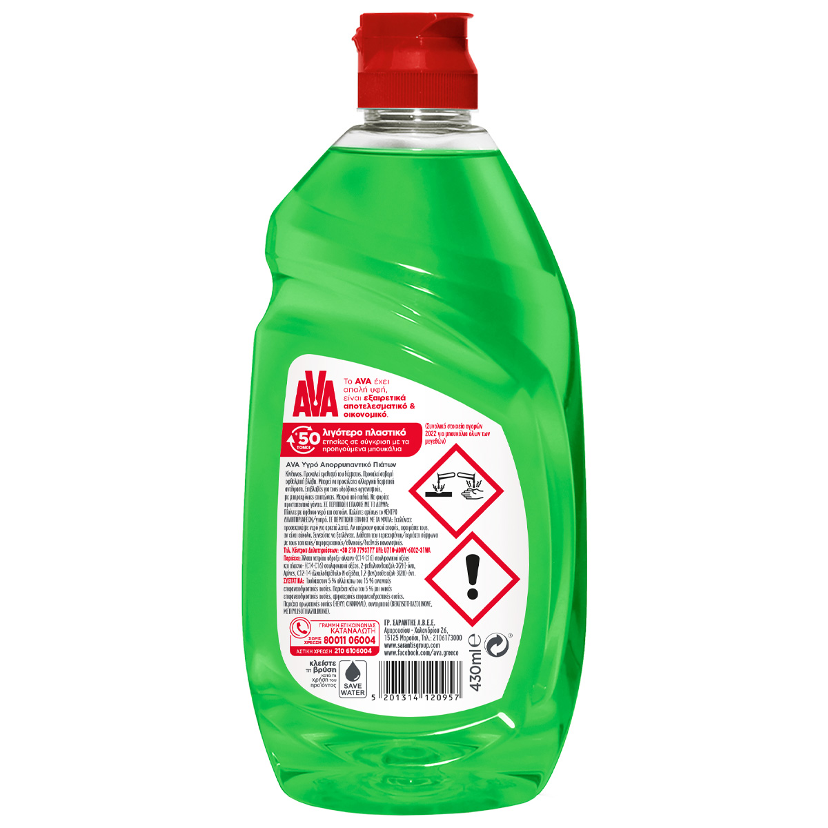 Το υγρό πιάτων AVA με λευκό ξύδι και υπέροχο άρωμα φρεσκάδας πράσινου μήλου, χάρη στην αποτελεσματική του σύνθεση, καθαρίζει εύκολα και γρήγορα αφήνοντας τα πιάτα σας αστραφτερά καθαρά. Αφαιρεί τα υπολείμματα φαγητού στη στιγμή εξασφαλίζοντας οικονομία νερού και χρόνου. 430ml Καθαρίζει εύκολα και γρήγορα Οικονομία νερού και χρόνου Υπέροχο άρωμα φρεσκάδας Εξαιρετικά αποτελεσματική σύνθεση Αποτελεσματικό και στο κρύο νερό AVA, Καθαρή Φροντίδα!