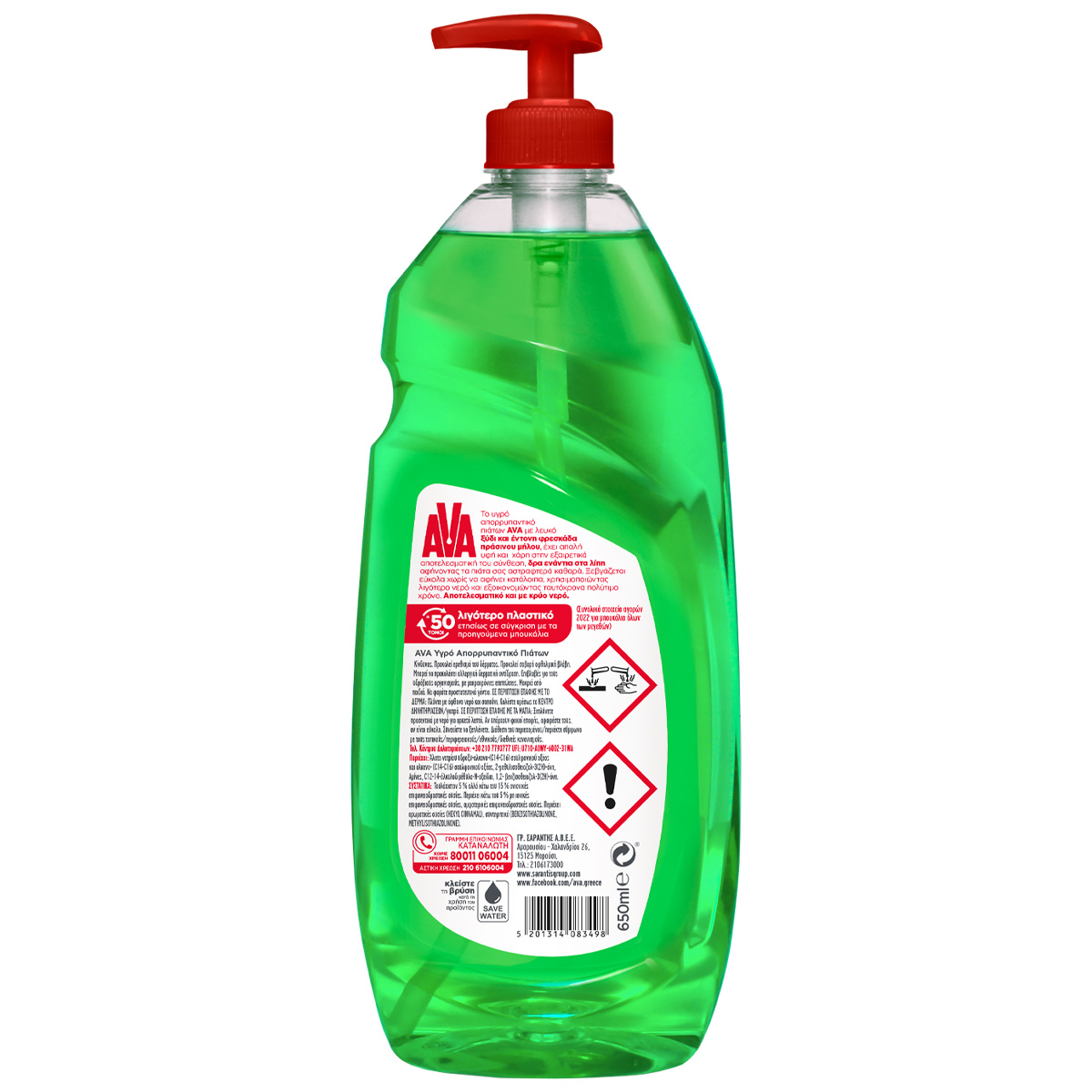 Το υγρό πιάτων AVA με λευκό ξύδι και υπέροχο άρωμα φρεσκάδας πράσινου μήλου, χάρη στην αποτελεσματική του σύνθεση, καθαρίζει εύκολα και γρήγορα αφήνοντας τα πιάτα σας αστραφτερά καθαρά. Διαθέτει πρακτική συσκευασία με δοσομετρική αντλία για ευκολία και οικονομία στη χρήση. Αφαιρεί τα υπολείμματα φαγητού στη στιγμή εξασφαλίζοντας οικονομία νερού και χρόνου. 650ml - Με δοσομετρική αντλία για ευκολία στη χρήση - Καθαρίζει εύκολα και γρήγορα - Οικονομία νερού και χρόνου - Υπέροχο άρωμα φρεσκάδας - Εξαιρετικά αποτελεσματική σύνθεση - Αποτελεσματικό και στο κρύο νερό AVA, Καθαρή Φροντίδα!