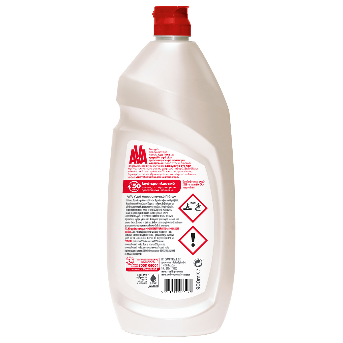 Το υγρό πιάτων AVA PERLE με εκχύλισμα χαμομηλιού, έχει υπέροχο άρωμα και κρεμώδη υφή προσφέροντας αίσθηση περιποίησης. Ξεβγάζεται εύκολα χωρίς να αφήνει κατάλοιπα χρησιμοποιώντας λιγότερο νερό και εξοικονομώντας ταυτόχρονα πολύτιμο χρόνο. 900ml Ξεβγάζεται εύκολα Κρεμώδης υφή Αίσθηση περιποίησης Εξαιρετικά αποτελεσματική σύνθεση Αποτελεσματικό και στο κρύο νερό AVA, Καθαρή Φροντίδα!