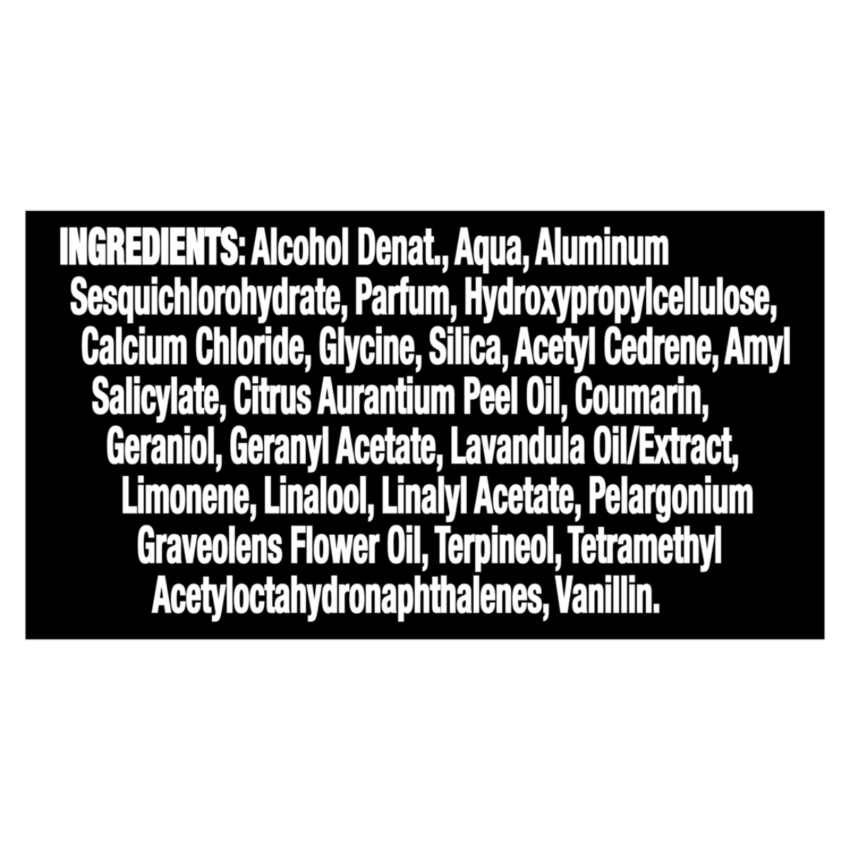 Alcohol Denat, Aqua, Aluminum Sesquichlorohydrate, Parfum, Hydroxypropylcellulose, Calcium Chloride, Glycine, Silica, Coumarin, Geraniol, Limonene, Linalool.