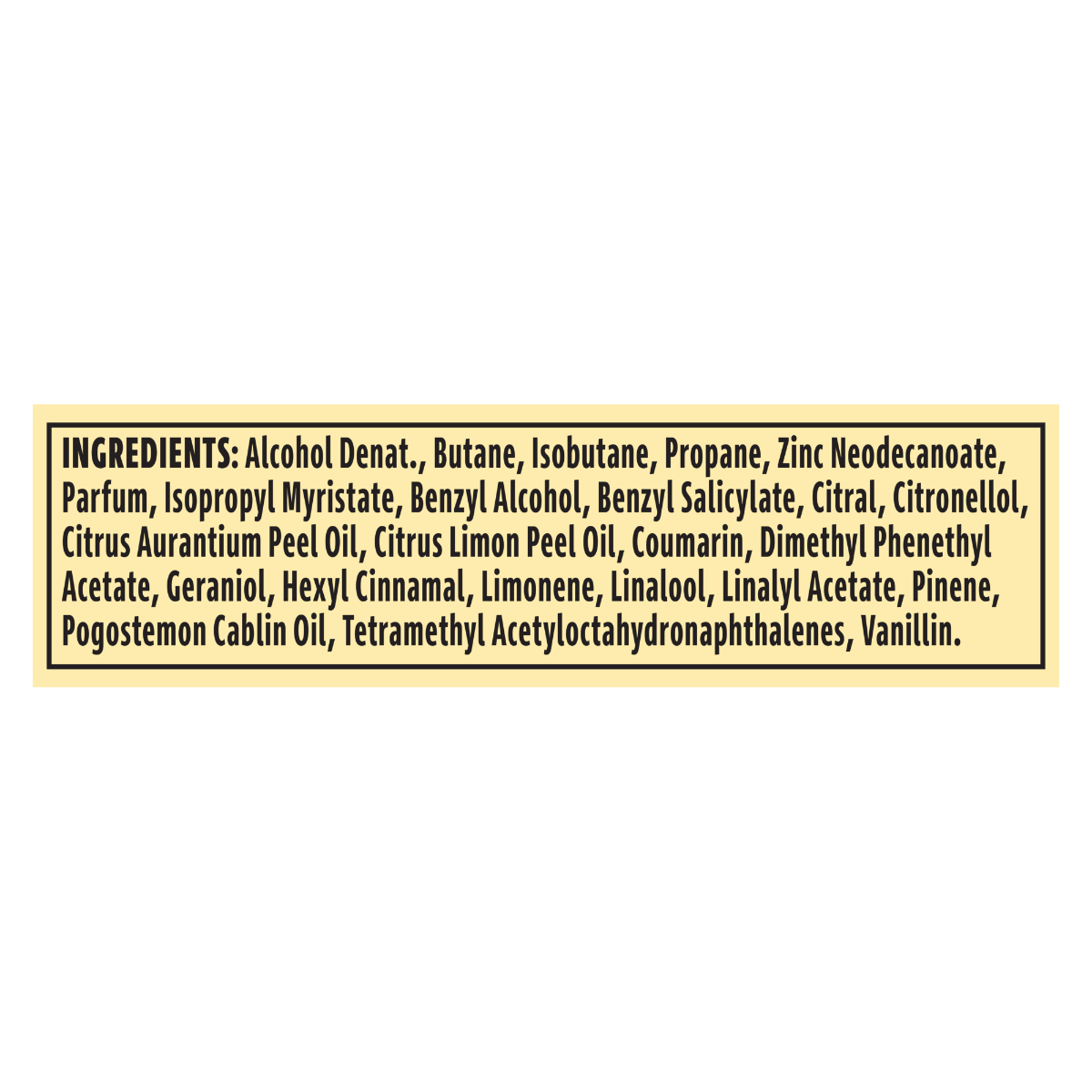 Alcohol Denat., Butane, Isobutane, Propane, Zinc Neodecanoate, Parfum, Isopropyl Myristate, Benzyl Alcohol, Benzyl Salicylate, Citral, Citronellol, Citrus Aurantium Peel Oil, Citrus Limon Peel Oil, Coumarin, Dimethyl Phenethyl Acetate, Geraniol, Hexyl Cinnamal, Limonene, Linalool, Linalyl Acetate, Pinene, Pogostemon Cablin Oil, Tetramethyl Acetyloctahydronaphthalenes, Vanillin.