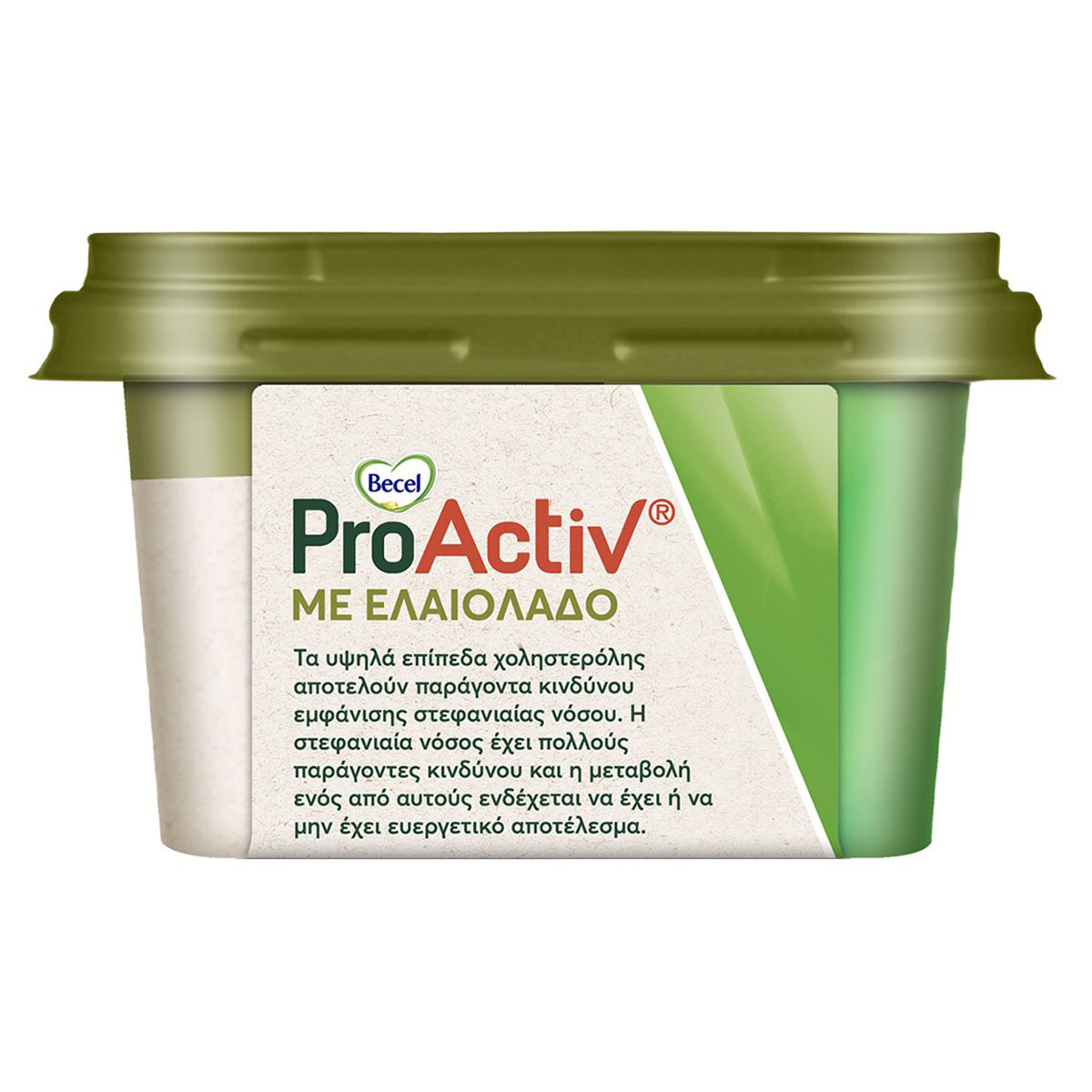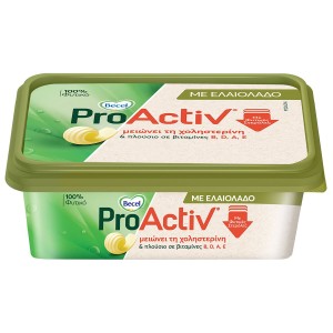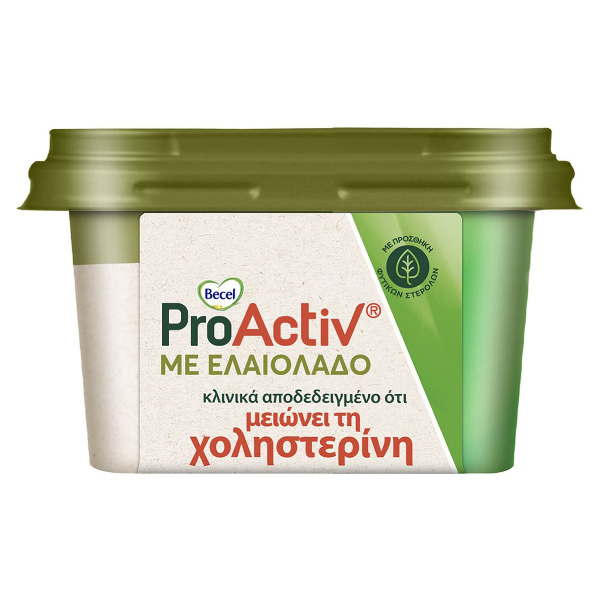 Το Becel ProActiv με Ελαιόλαδο 450g είναι ένα προϊόν επάλειψης, με προσθήκη ελαιολάδου, που είναι κλινικά αποδεδειγμένο ότι μειώνει αποτελεσματικά τη χοληστερίνη 7-10%, σε 2-3 εβδομάδες στα πλαίσια μιας ισορροπημένης διατροφής και ενός υγιεινού τρόπου ζωής.Είναι πλούσιο σε βιταμίνες Α, Β1, Β2, Β6, Β12, D, E, και αποτελεί πηγή φολικού οξέος.