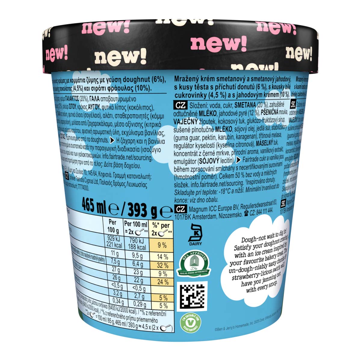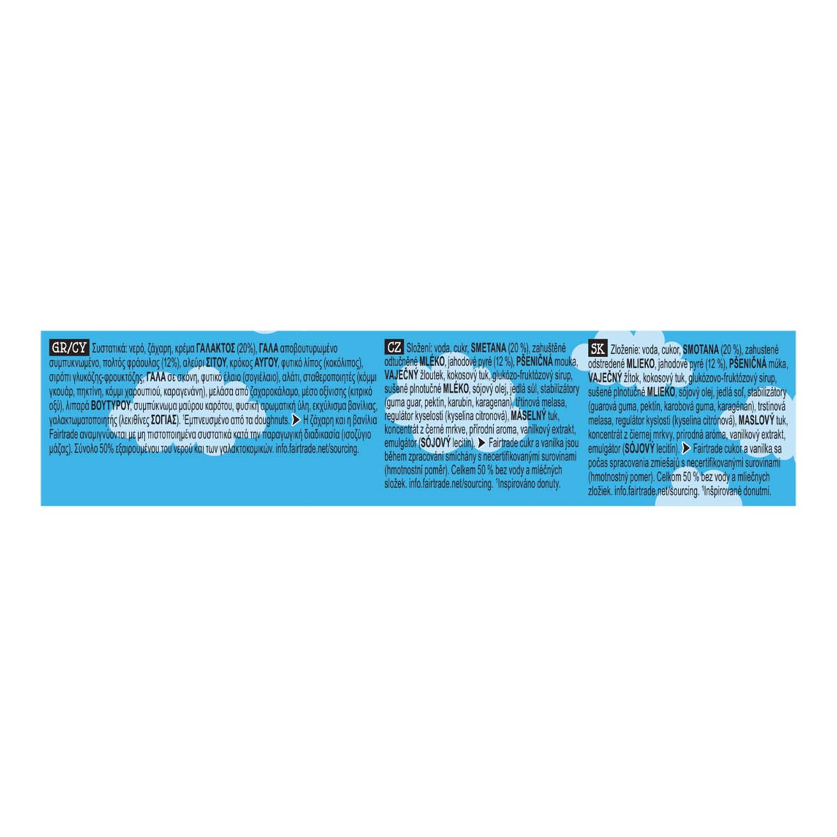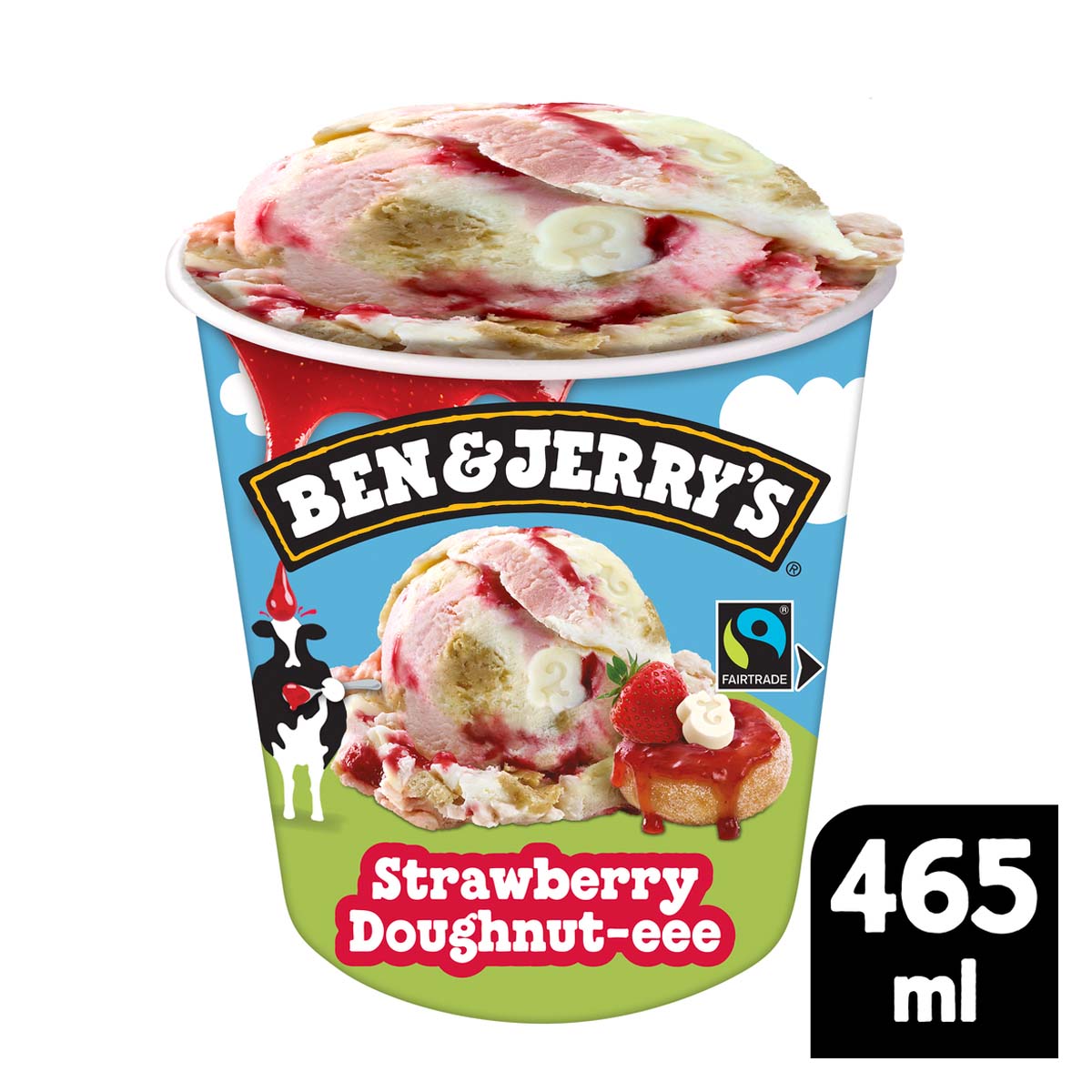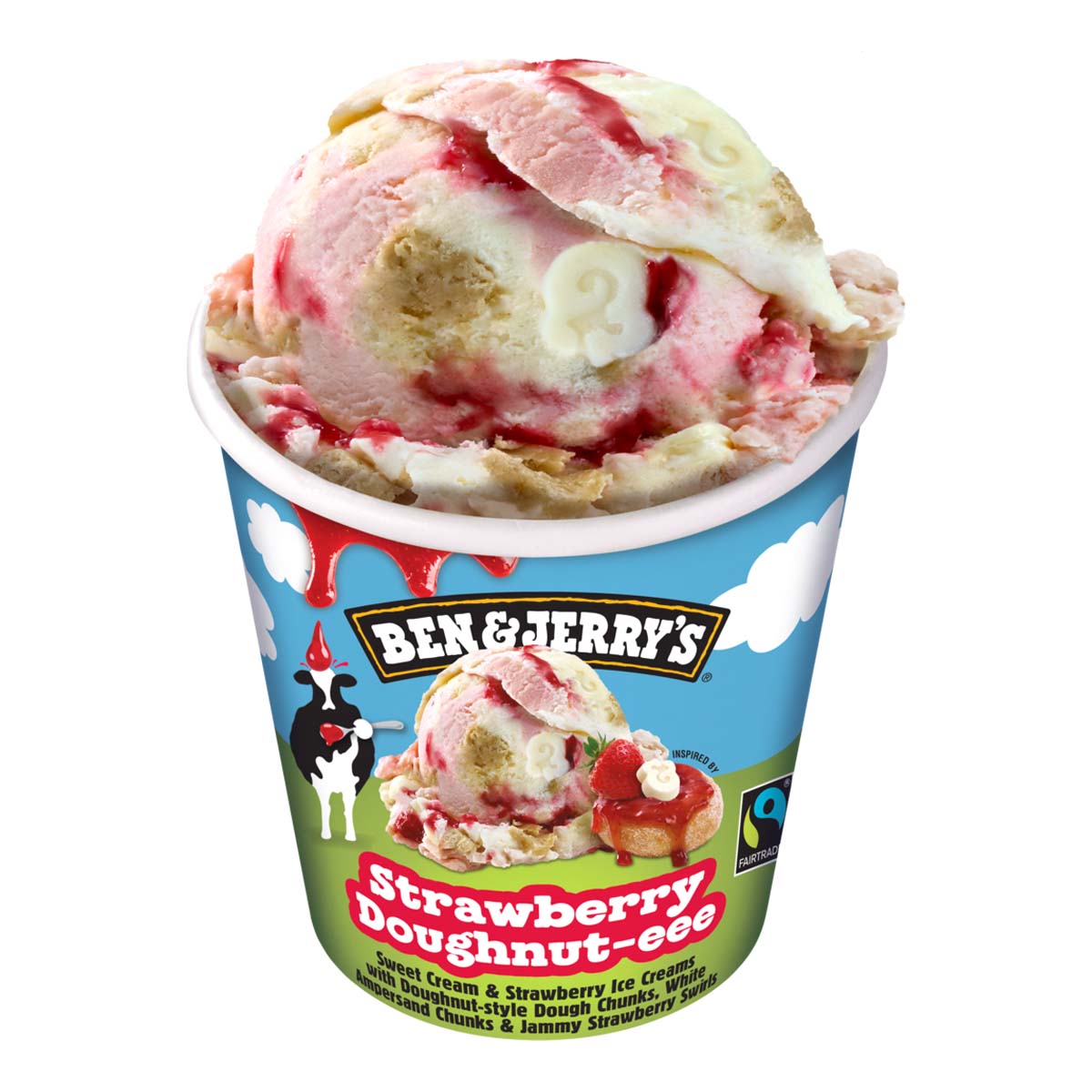 Παγωτό φράουλας και γλυκιάς κρέμας με κομμάτια ζύμης με γεύση doughnut (6%), κομμάτια με γεύση λευκής σοκολάτας (4,5%) και σιρόπι φράουλας (10%).