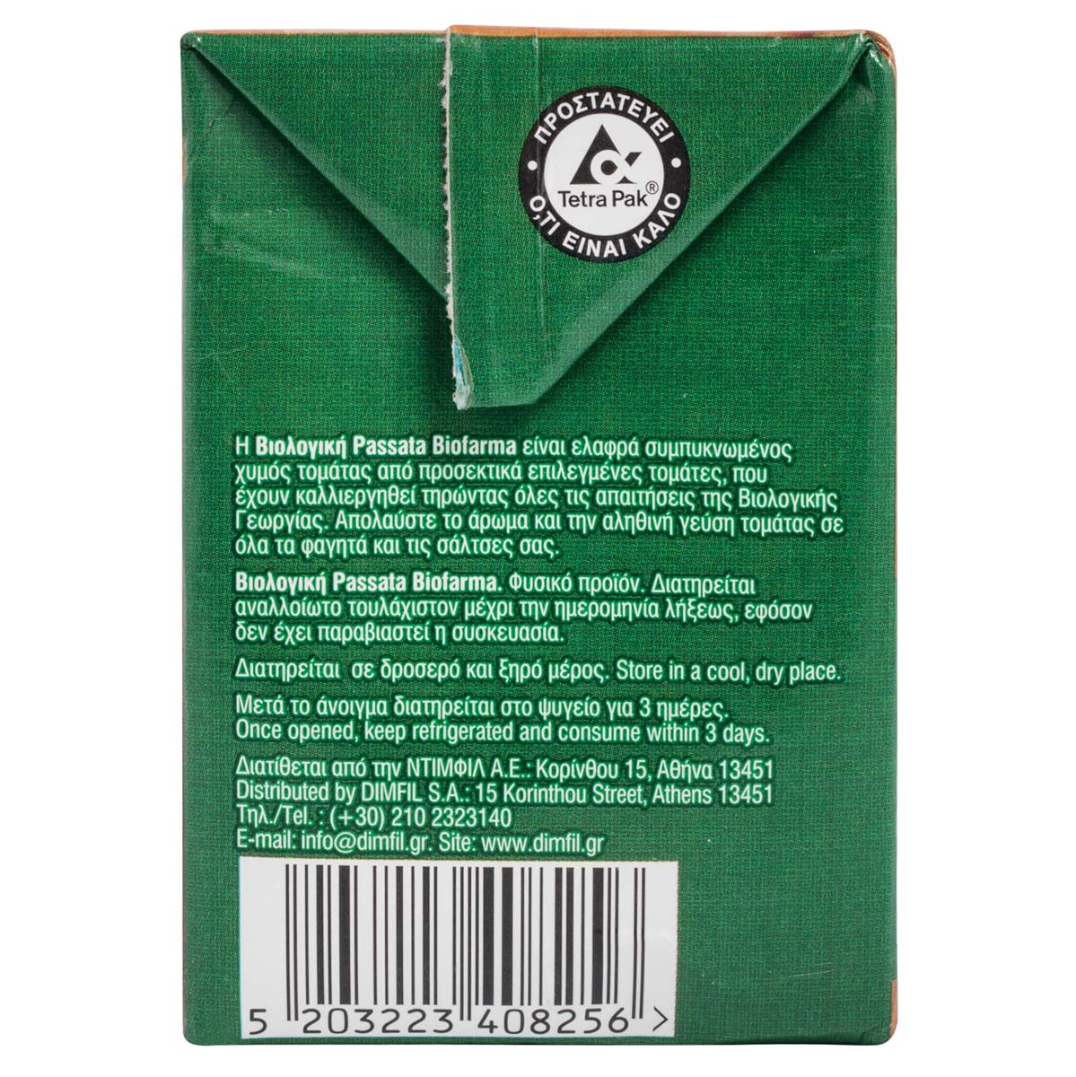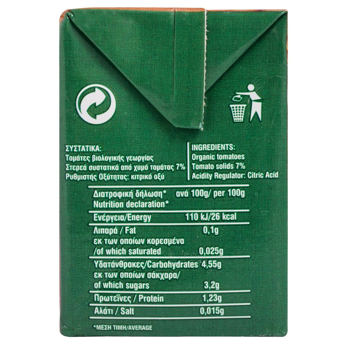 Ελαφρά συμπυκνωμένος βιολογικός χυμός Bio Farma ωμής τομάτας χωρίς σπόρια και φλούδες, ο οποίος ταιριάζει σε όλα τα φαγητά κατσαρόλας και φούρνου. Αποτελείται από προσεκτικά επιλεγμένες τομάτες, που έχουν καλλιεργηθεί με μεράκι από βιοκαλλιεργητές που τηρούν όλες τις απαιτήσεις της Βιολογικής Γεωργίας.