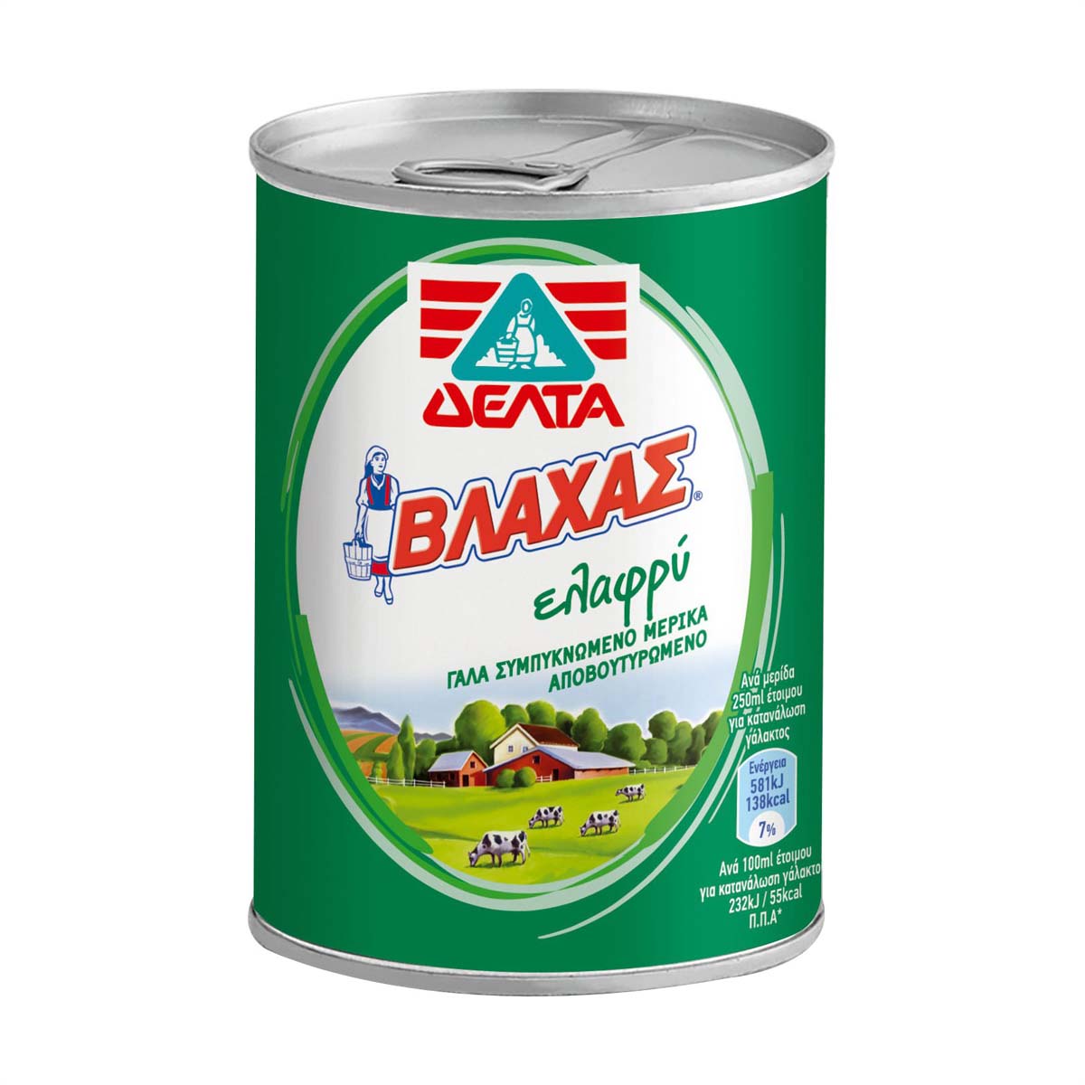 Το ΔΕΛΤΑ βλάχας συμπυκνωμένο γάλα ελαφρύ έχει γεμάτη και πλούσια γεύση. Είναι ιδανικό και για χρήση σε μαγειρική, ζαχαροπλαστική ή για τον καφέ.