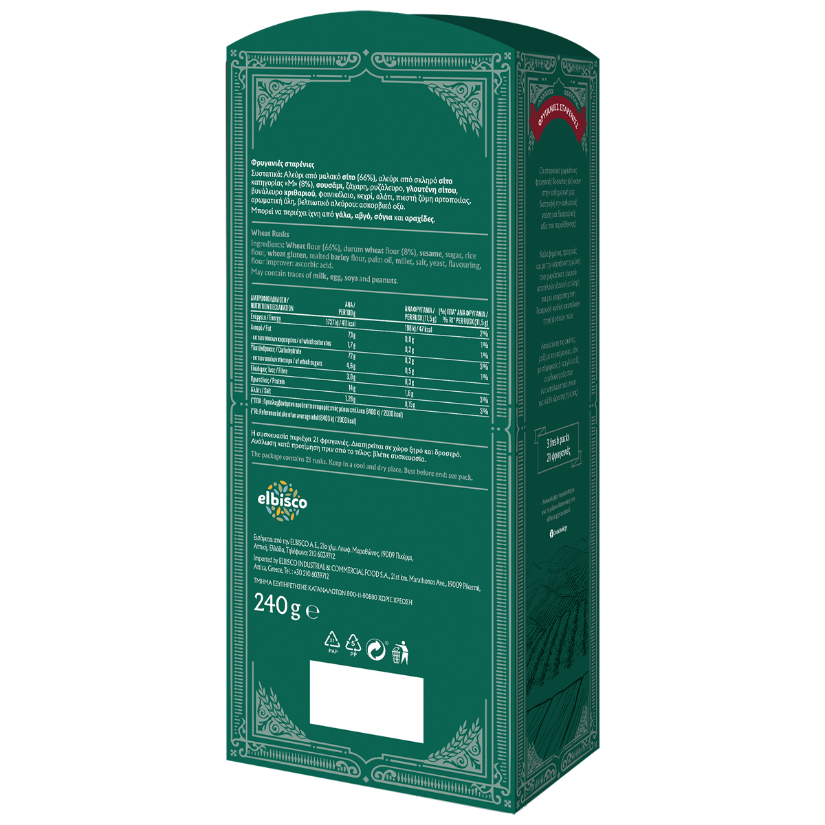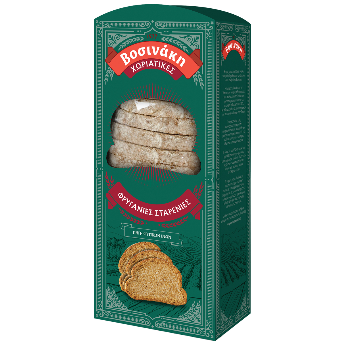 Οι φρυγανιές Βοσινάκη Χωριάτικες Σταρένιες φέρνουν στην καθημερινή μας διατροφή την αυθεντική γεύση και διατροφική αξία του παρελθόντος! Καλοψημένες, τραγανές και με την αξεπέραστη γεύση του χωριάτικου ψωμιού αποτελούν ιδανική επιλογή για μια ισορροπημένη διατροφή, καθώς αποτελούν πηγή φυτικών ινών. Απολαύστε τις σκέτες, μαζί με το γεύμα σας, είτε με αλμυρούς ή και γλυκούς συνδυασμούς σαν ένα απολαυστικό σνακ για κάθε ώρα της ημέρας!