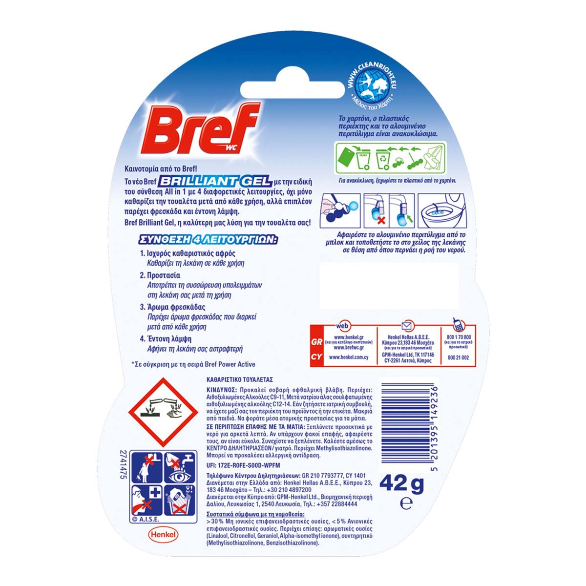 To Bref Brilliant Gel Arctic Ocean Scent είναι το πρώτο premium μπλοκ τουαλέτας. Χάρη στην ενισχυσμένη με Advanced Gel Technology φόρμουλα 4 λειτουργιών, το μπλοκ τουαλέτας καθαρίζει την λεκάνη σας εμποδίζοντας την συσσώρευση υπολειμμάτων, χαρίζοντας ένα υπέροχο άρωμα φρεσκάδας και λάμψη. Το νέο μπλοκ τουαλέτας προσφέρει ακόμα περισσότερο άρωμα* κι αποτελεί την ιδανική λύση για την τουαλέτα σας! Απλά τοποθετήστε το προϊόν στο χείλος της λεκάνης, προσαρμόστε το σύμφωνα με τη ροή του νερού και απολαύστε μέγιστη καθαριότητα και φρεσκάδα αρώματος Αρκετικού Ωκεανού σε κάθε χρήση!