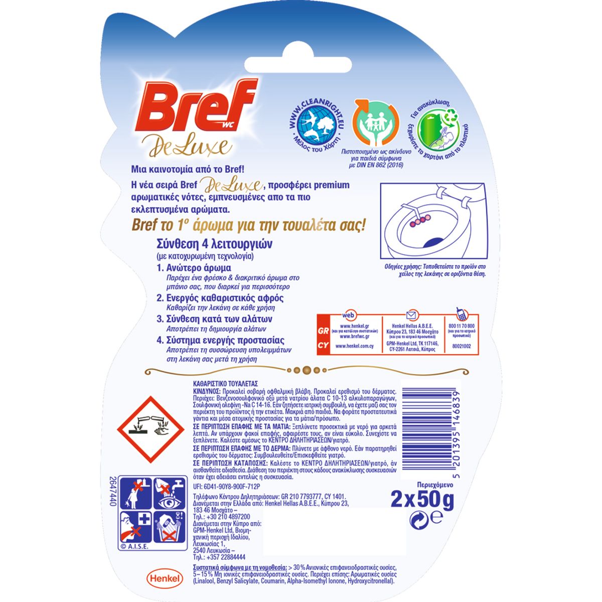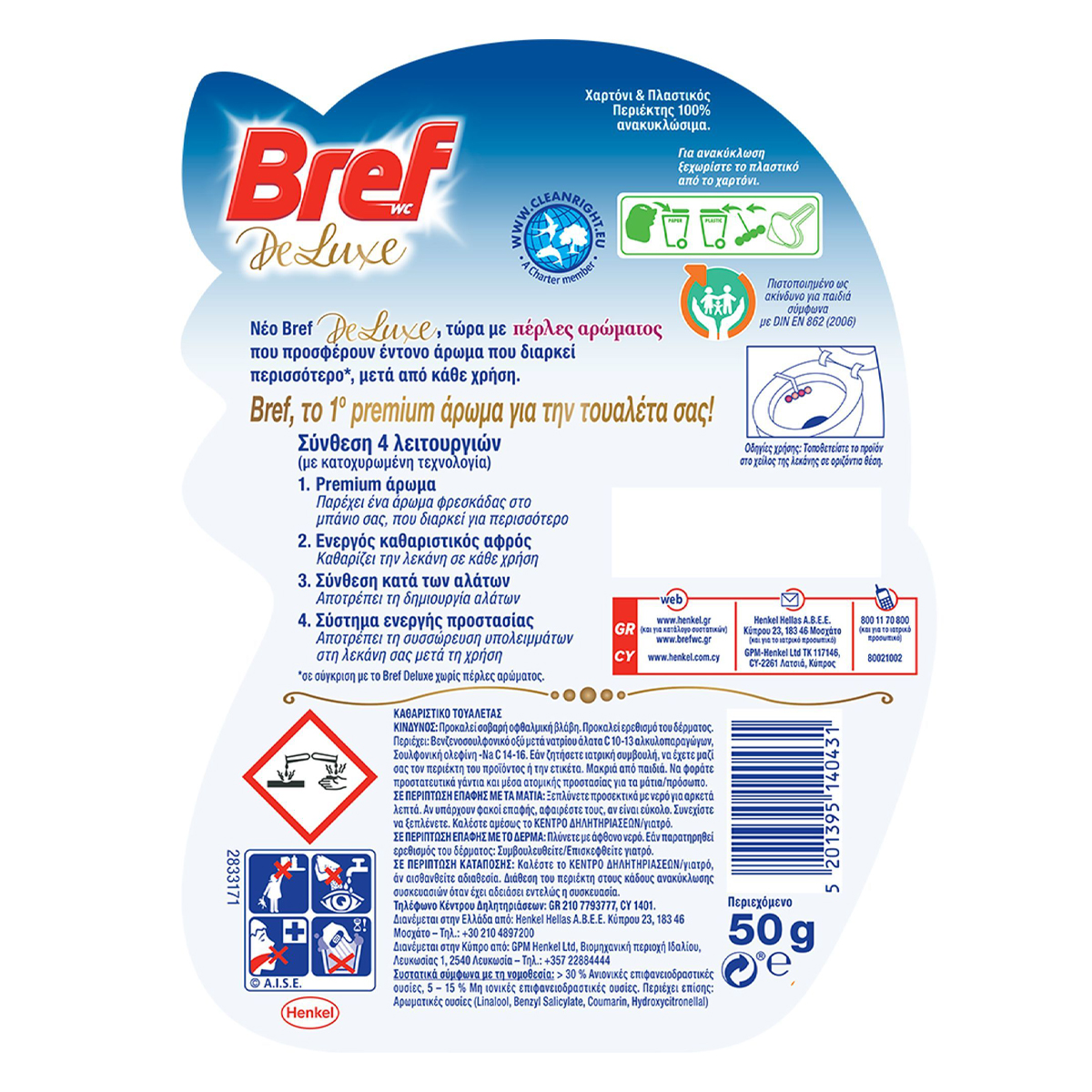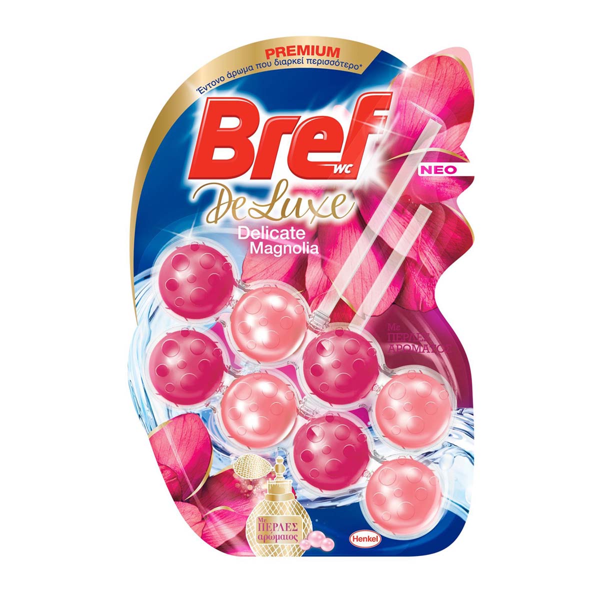 Νιώθετε πως η τουαλέτα σας αξίζει ένα ξεχωριστό και πιο πολυτελές άρωμα; Το Bref De Luxe είναι το 1o WC Block, το οποίο προσφέρει ένα premium και ντελικάτο άρωμα που διαρκεί, εμπνευσμένο από επώνυμα αρώματα, ενώ συνεχίζει να προσφέρει την γνωστή καθαριότητα και φρεσκάδα του BREF. Για να απολαύσετε τα αποτελέσματα, απλώς, τοποθετήστε το στην λεκάνη της τουαλέτας. Μια καινοτομία από το Bref! Χάρη στις εμπνευσμένες από τα επώνυμα αρώματα νότες του, τo Bref De Luxe θα σας σας ταξιδέψει σε ένα ξεχωριστό κόσμο γεμάτο άρωμα. Το Bref De Luxe με άρωμα Delicate Magnolia θα προσφέρει σε κάθε μπάνιο ένα σαγηνευτικά πολυτελές άρωμα και σε συνδυασμό με την καθαριστική του δράση, θα το διατηρήσει φρέσκο και καθαρό.