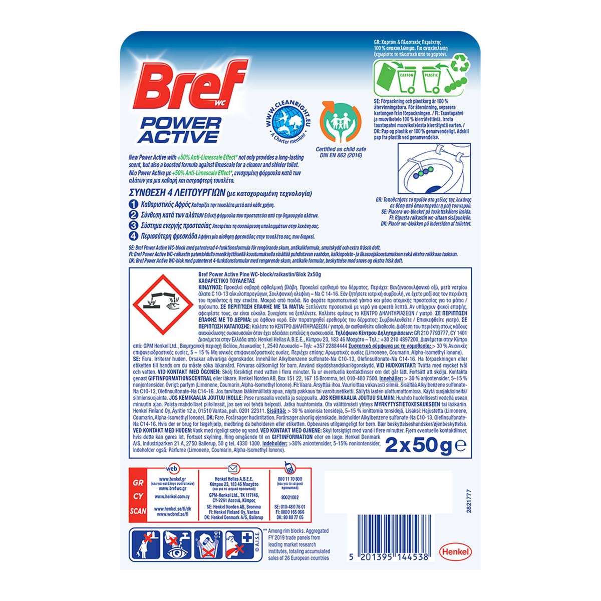 Νέο Power Active με +50% Anti-Limescale Effect, ενισχύμενη φόρμουλα κατά των αλάτων για μια καθαρή και αστραφτερή τουαλέτα! Η μοναδική του σύνθεση 4 λειτουργειών, αποτρέπει τον σχηματισμό αλάτων, απελευθερώνει καθαριστικό αφρό, παρέχει ένα σύστημα ενεργής προστασίας, αποτρέποντας την συσσώρευση υπολειμμάτων και προσφέρει φρεσκάδα που διαρκεί! Απλά τοποθετήστε το προϊόν στο χείλος της λεκάνης, προσαρμόστε το σύμφωνα με τη ροή του νερού και απολαύστε μέγιστη καθαριότητα και φρεσκάδα σε κάθε χρήση!