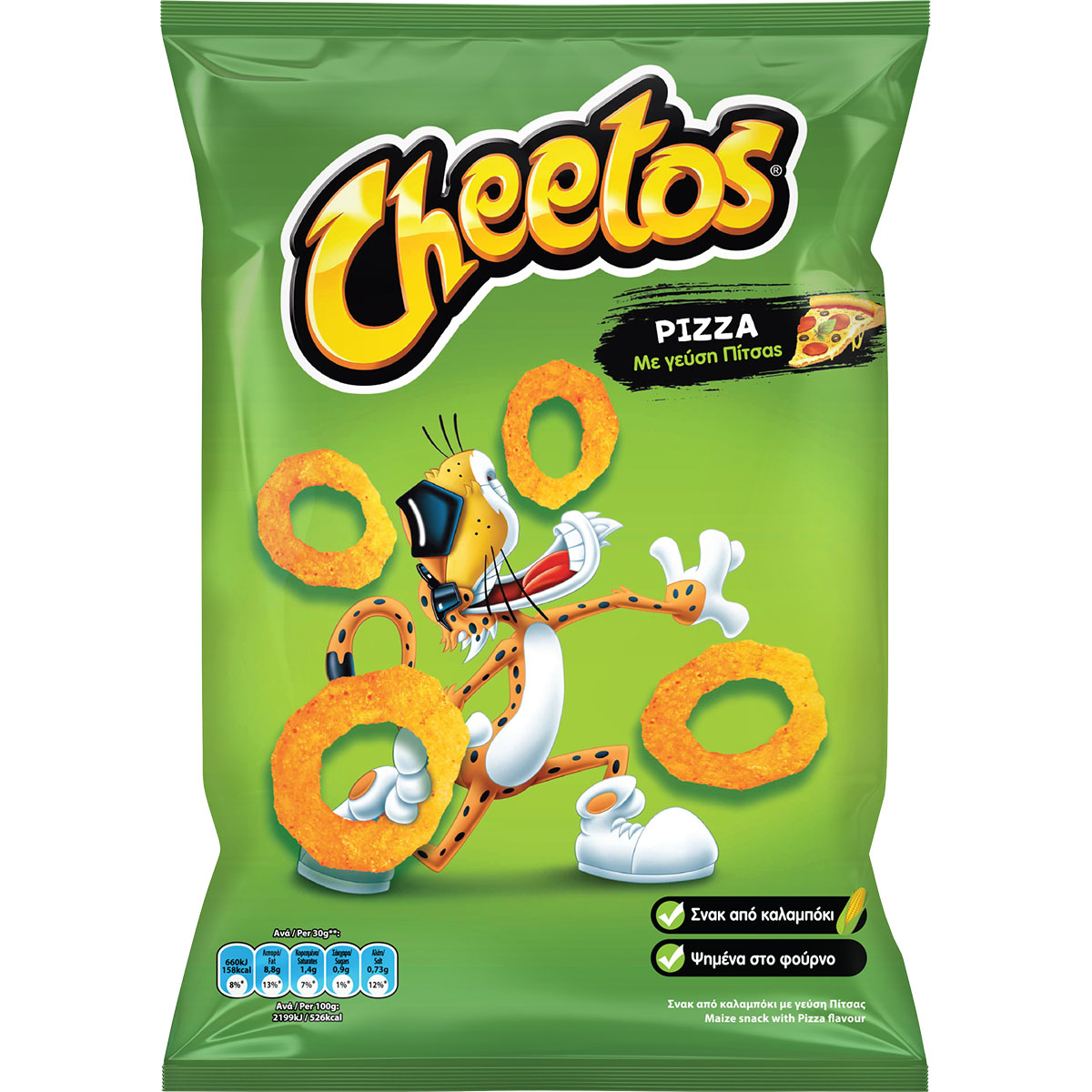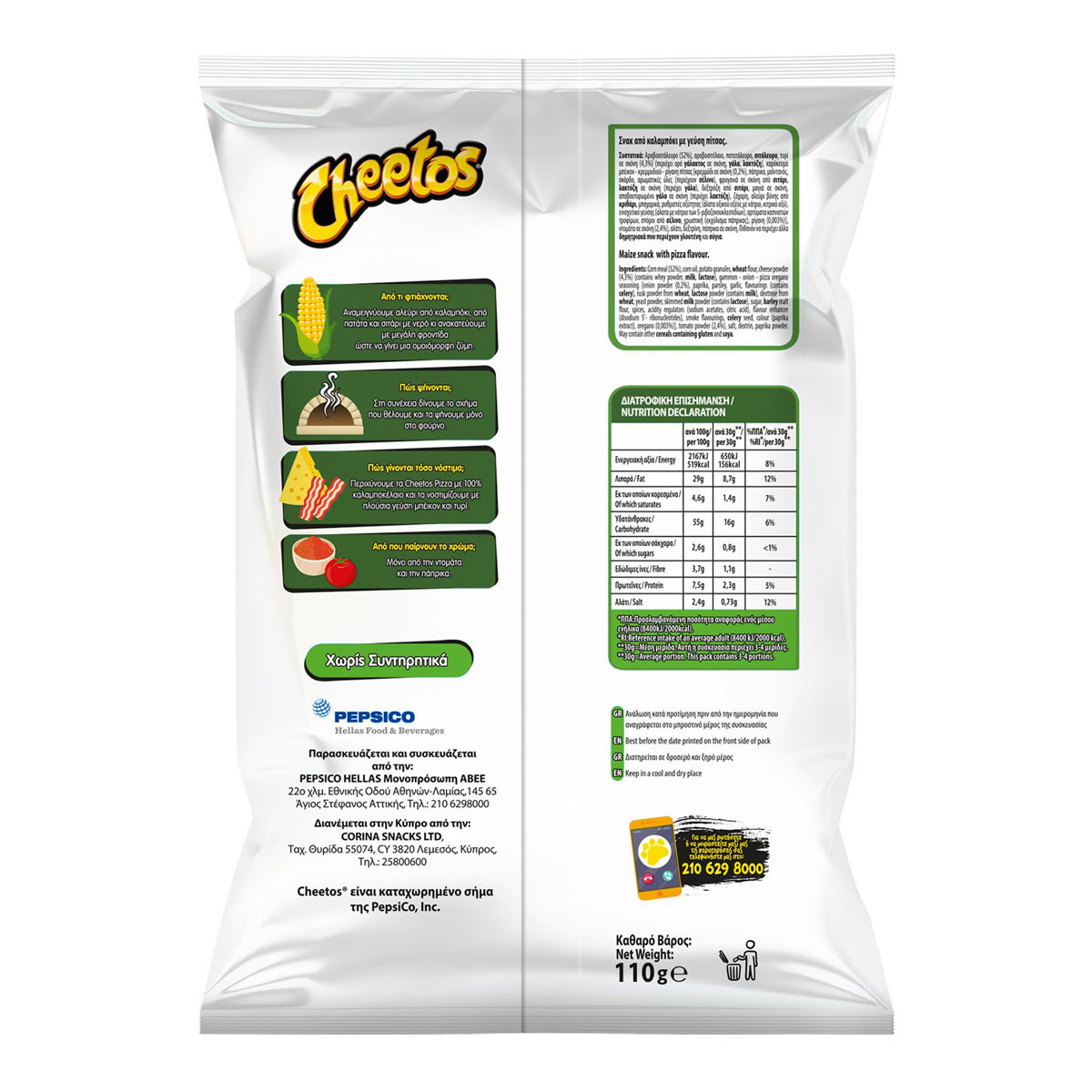 Αραβοσιτάλευρο (50%), αραβοσιτέλαιο, πατατάλευρο, ΣΙΤΑΛΕΥΡΟ (7%) (περιέχει παράγωγα από ΣΙΤΑΡΙ), ΤΥΡΙ σε σκόνη (4,3%) (περιέχει ΓΑΛΑ), γεύση μπέϊκον-κρεμμυδιού- ρίγανη πίτσας [κρεμμύδι σε σκόνη (0,4%), πάπρικα, μαϊντανός, σκόρδο, αρωματικές ύλες (περιέχουν ΣΕΛΙΝΟ, λάδι από σπόρους ΣΕΛΙΝΟΥ), φρυγανιά σε σκόνη (περιέχει παράγωγα από ΣΙΤΑΡΙ), ΛΑΚΤΟΖΗ σε σκόνη (περιέχει παράγωγα ΓΑΛΑΚΤΟΣ, ΛΑΚΤΟΖΗ), δεξτρόζη (περιέχει παράγωγα από ΣΙΤΑΡΙ), μαγιά σε σκόνη, αποβουτυρωμένο ΓΑΛΑ σε σκόνη (περιέχει παράγωγα ΓΑΛΑΚΤΟΣ, ΛΑΚΤΟΖΗ), ζάχαρη, αλεύρι βύνης από ΚΡΙΘΑΡΙ (περιέχει παράγωγα από ΚΡΙΘΑΡΙ), μπαχαρικά, κραμβέλαιο, ρυθμιστές οξύτητας (άλατα οξικού οξέος με νάτριο, κιτρικό οξύ), ενισχυτικό γεύσης (άλατα με νάτριο των 5-ριβοζονουκλεοτιδίων), αρτύματα καπνιστών τροφίμων, σπόροι από ΣΕΛΙΝΟ, χρωστική (εκχύλισμα πάπρικας), λάδι ρίγανης (0,004%)], ντομάτα σε σκόνη (2,4%), καζεϊνικό νάτριο (περιέχει παράγωγα ΓΑΛΑΚΤΟΣ, ΛΑΚΤΟΖΗ), αλάτι, πάπρικα σε σκόνη.