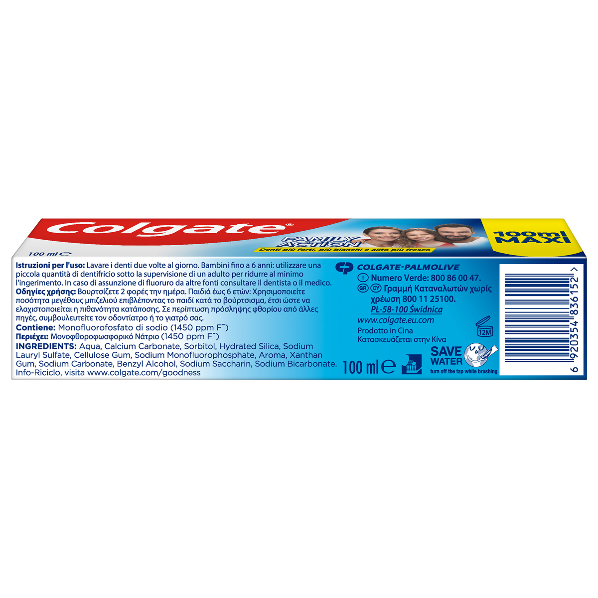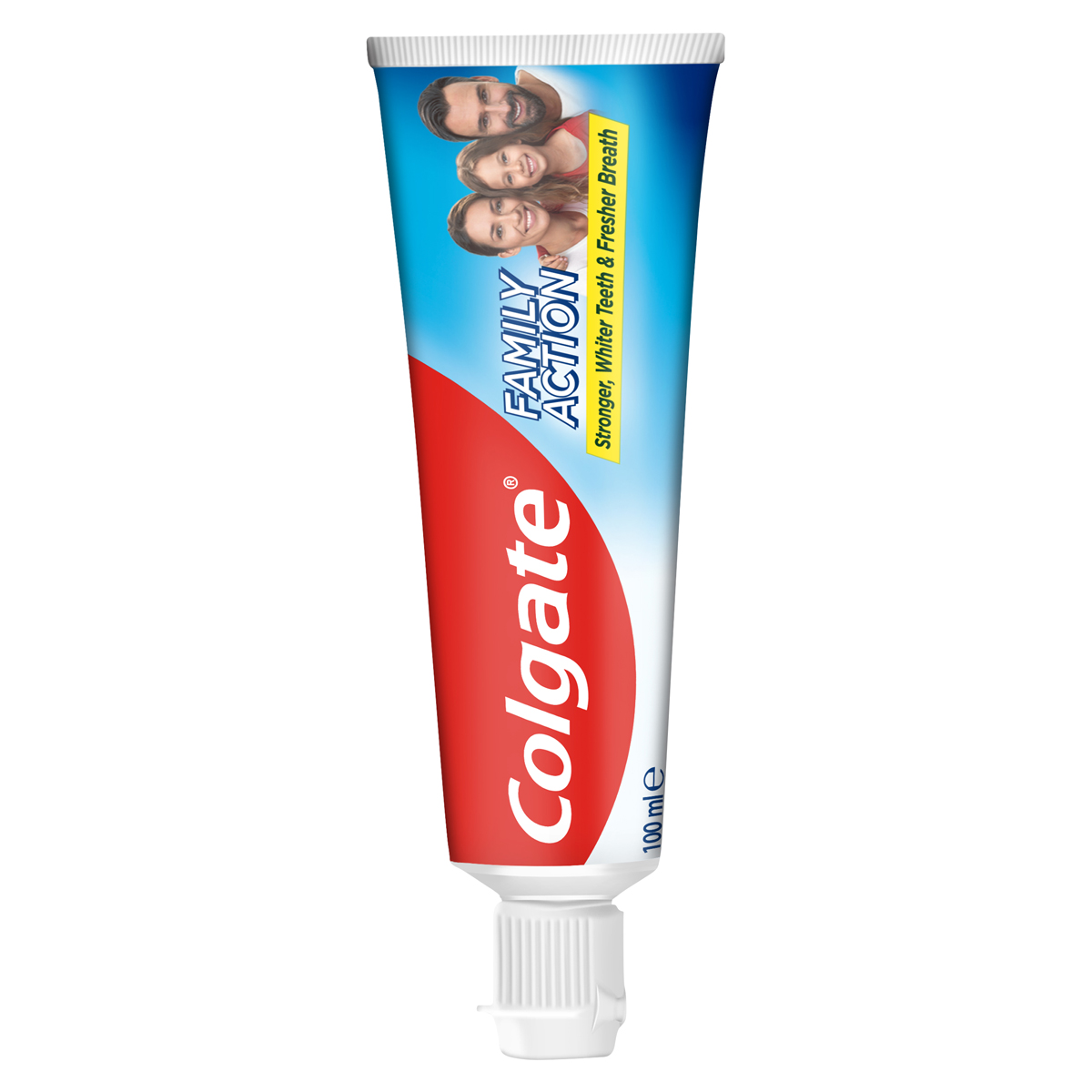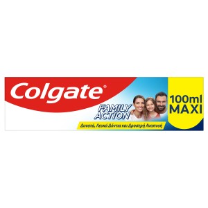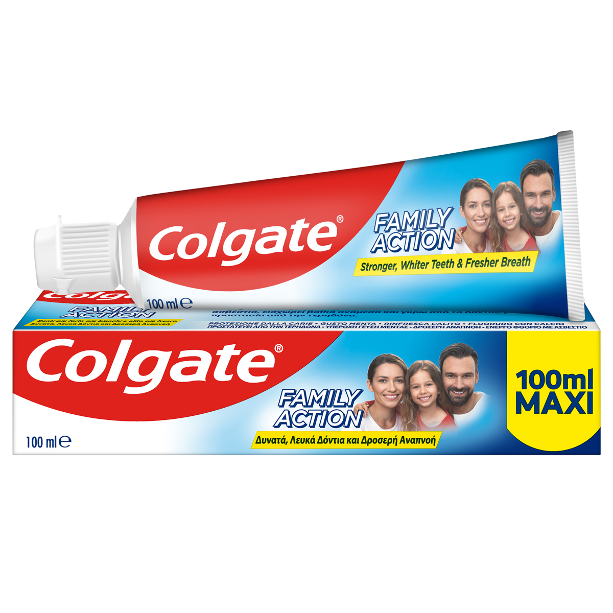 Η φθοριούχος οδοντόκρεμα Colgate Family Action προσφέρει δυνατά δόντια και δροσερή αναπνοή.
