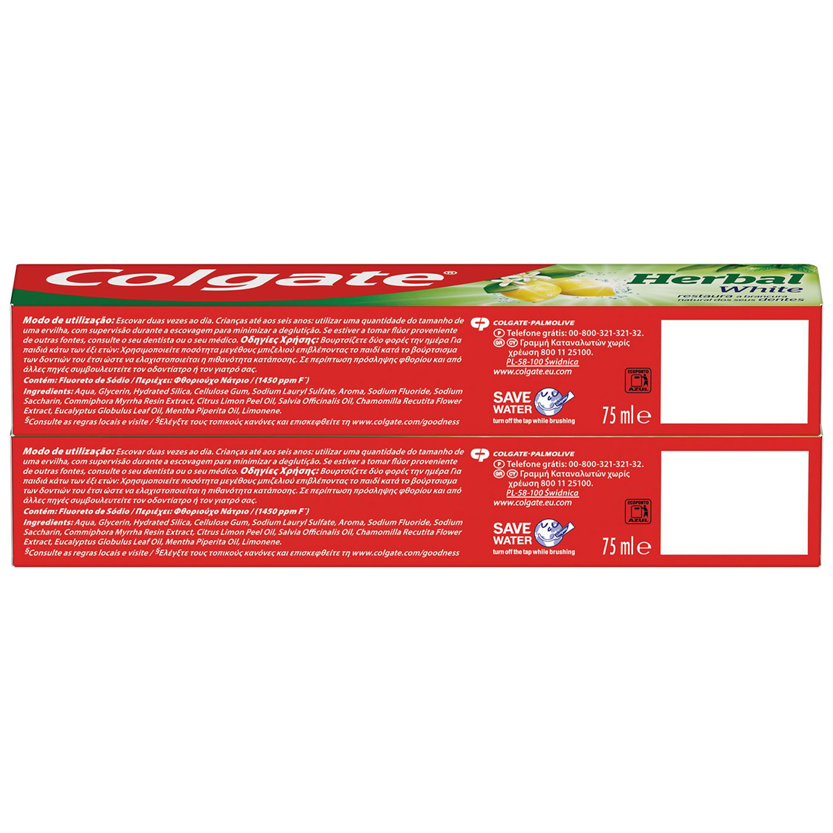 Η οδοντόκρεμα Colgate Herbal White με αποκλειστική σύνθεση από λεμόνι και φυσικά εκχυλίσματα βοτάνων, απομακρύνει απαλά τους χρωματικούς λεκέδες επαναφέροντας τη φυσική λευκότητα των δοντιών.