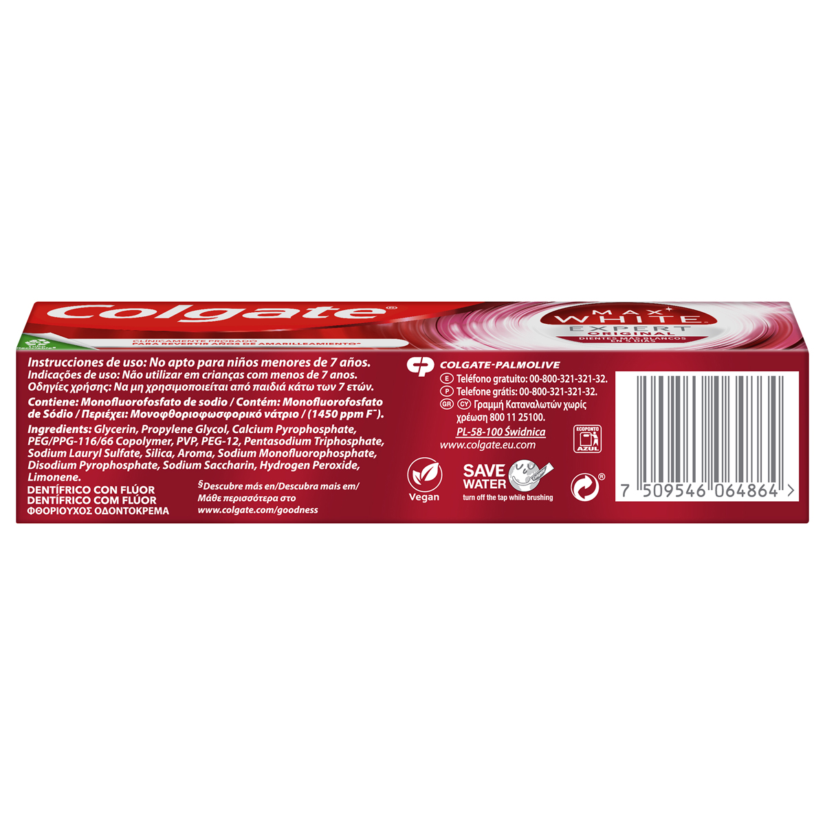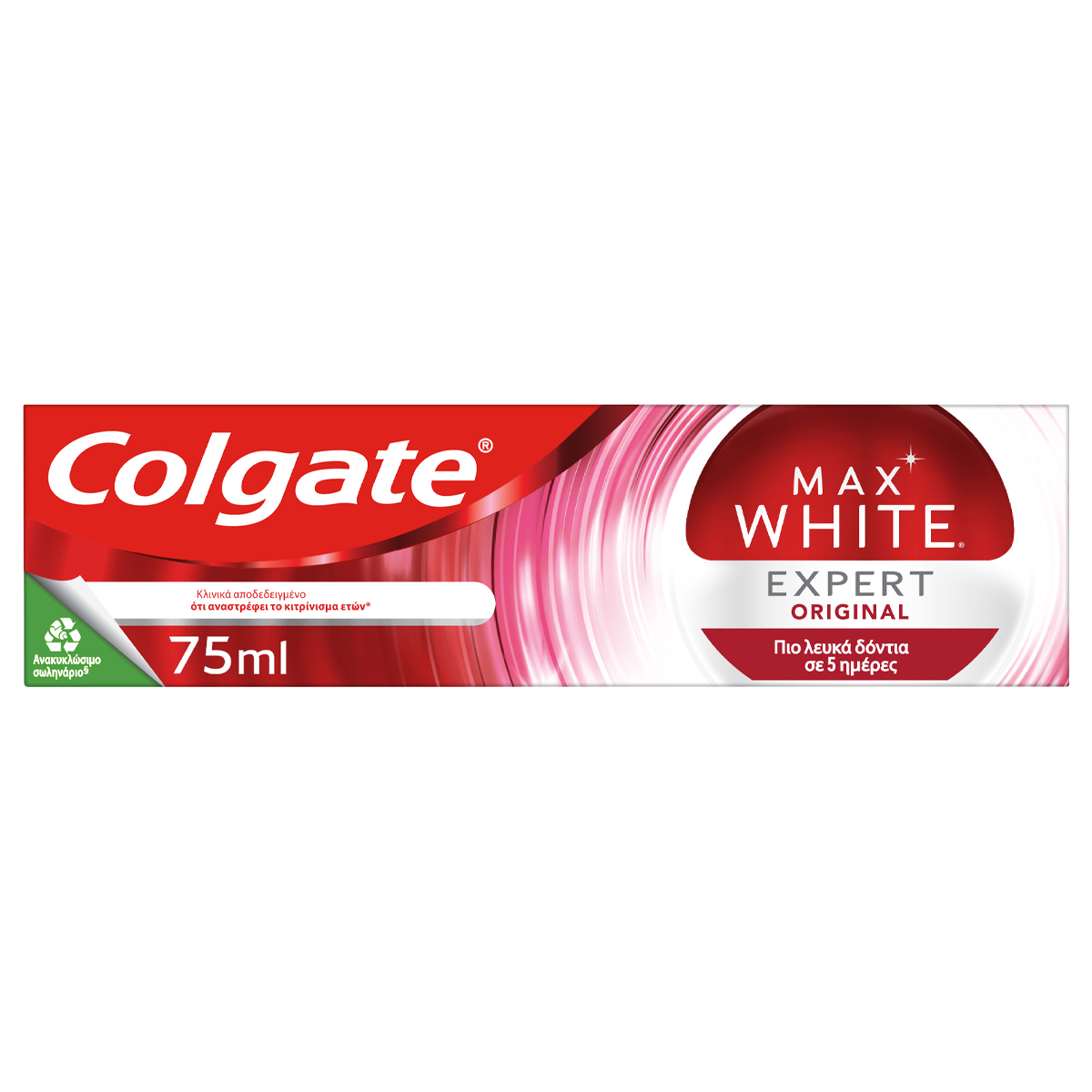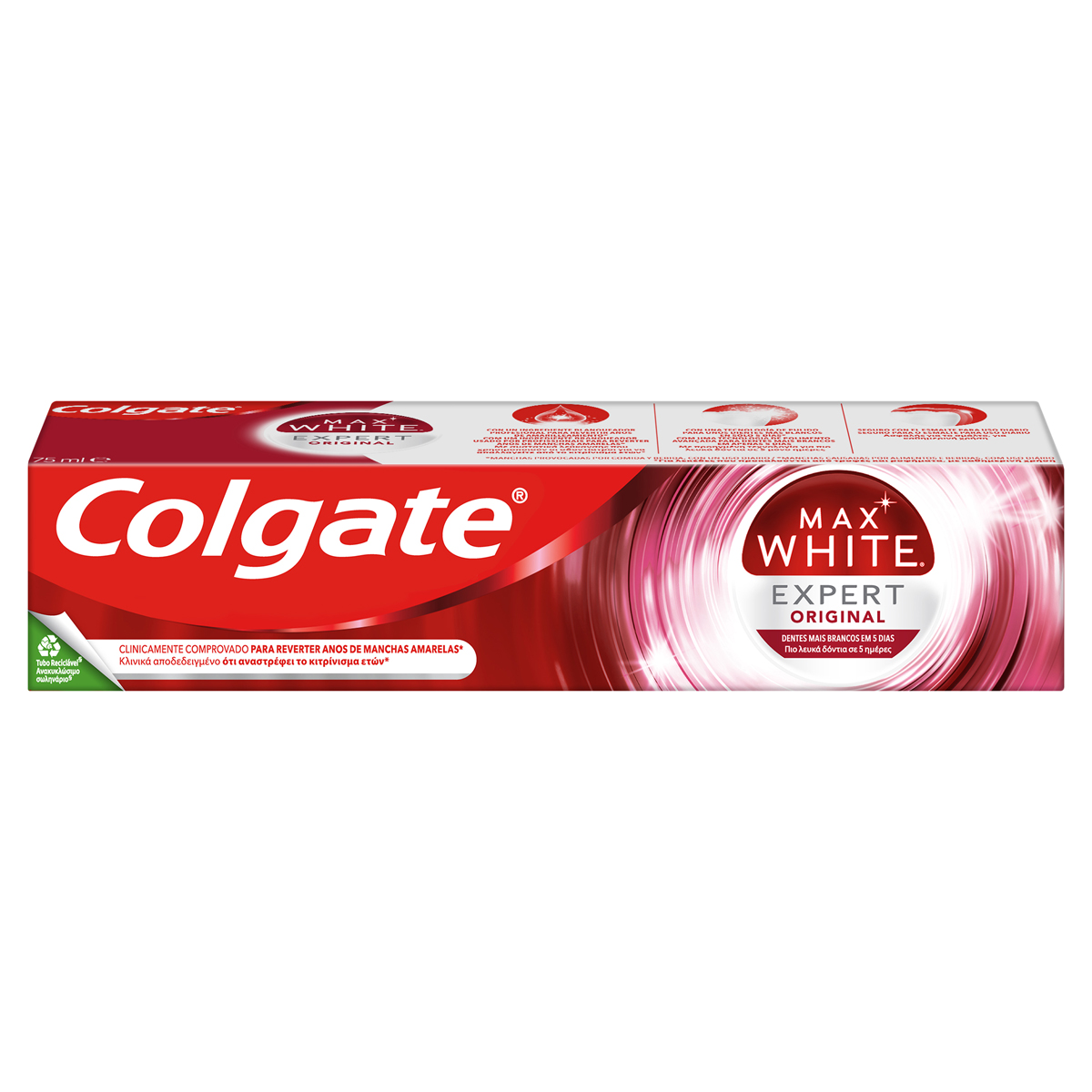 Η οδοντόκρεμα λεύκανσης Colgate Max White Expert Original περιέχει συστατικά λεύκανσης που χρησιμοποιούν οι οδοντίατροι για να απαλλαγείτε από το κιτρίνισμα ετών και λεκέδες που προκαλούνται από τροφές και ροφήματα. Με προηγμένη τεχνολογία για πιο λευκά δόντια σε 5 μόνο ημέρες. Ασφαλές για το σμάλτο, για καθημερινή χρήση.