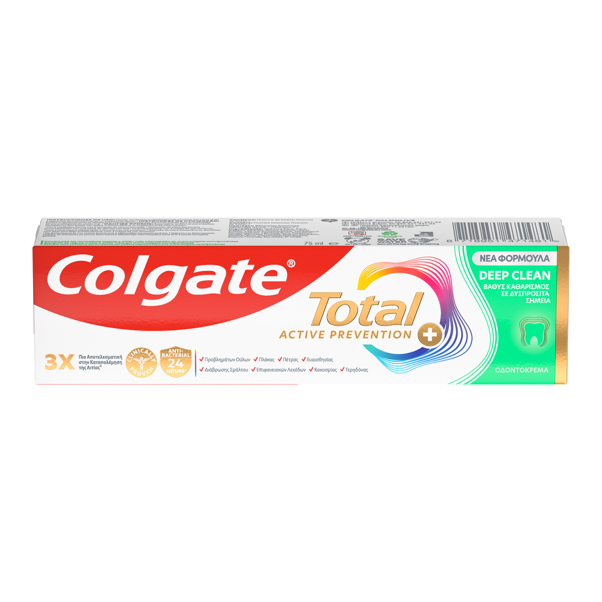 Η οδοντόκρεμα Colgate Total Active Prevention + Deep Clean είναι κλινικά αποδεδειγμένη & προλαμβάνει ενεργά πολλά προβλήματα στοματικής υγείας με 24ωρη αντιβακτηριακή προστασία.