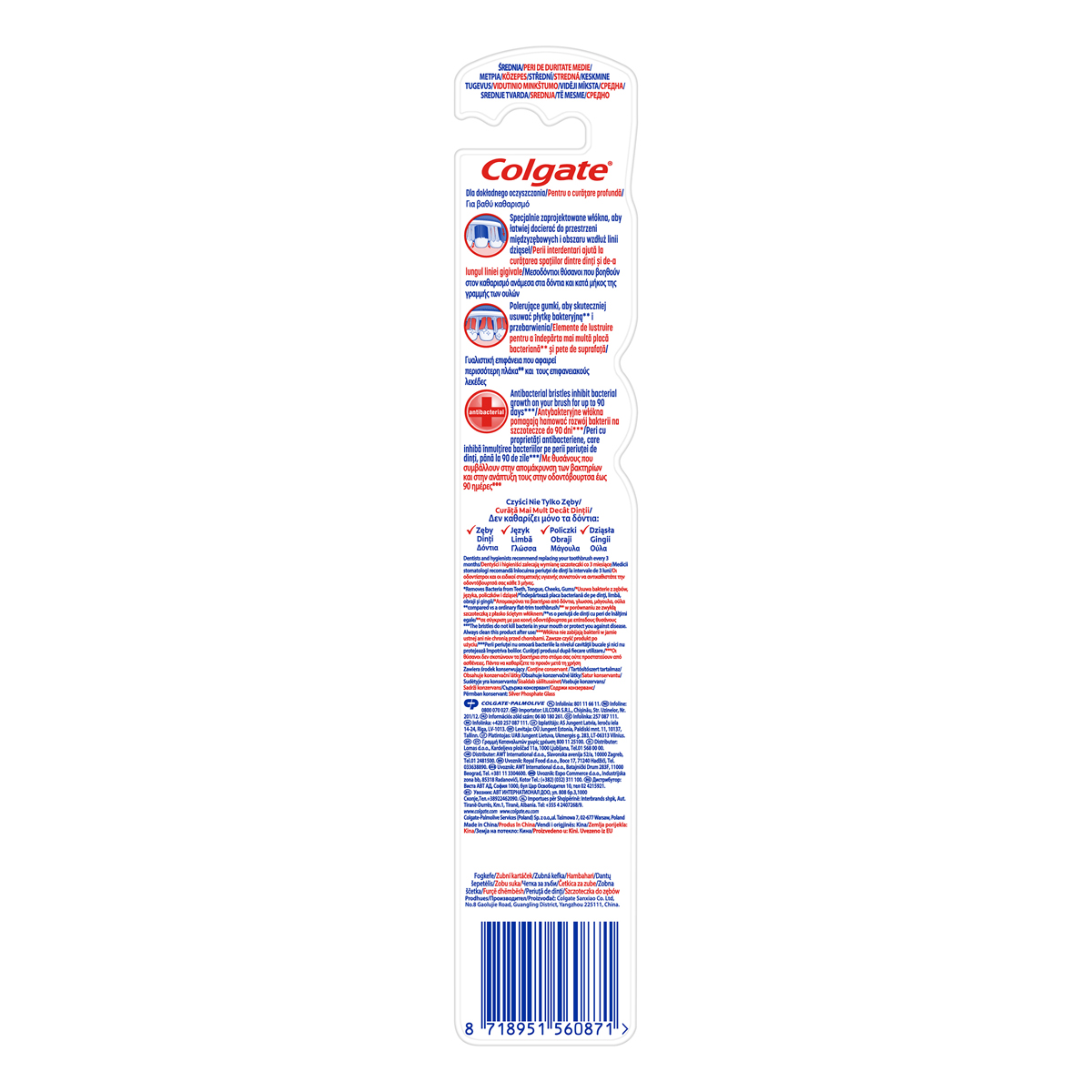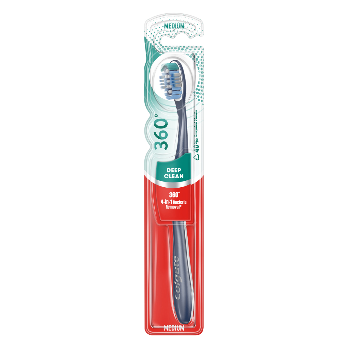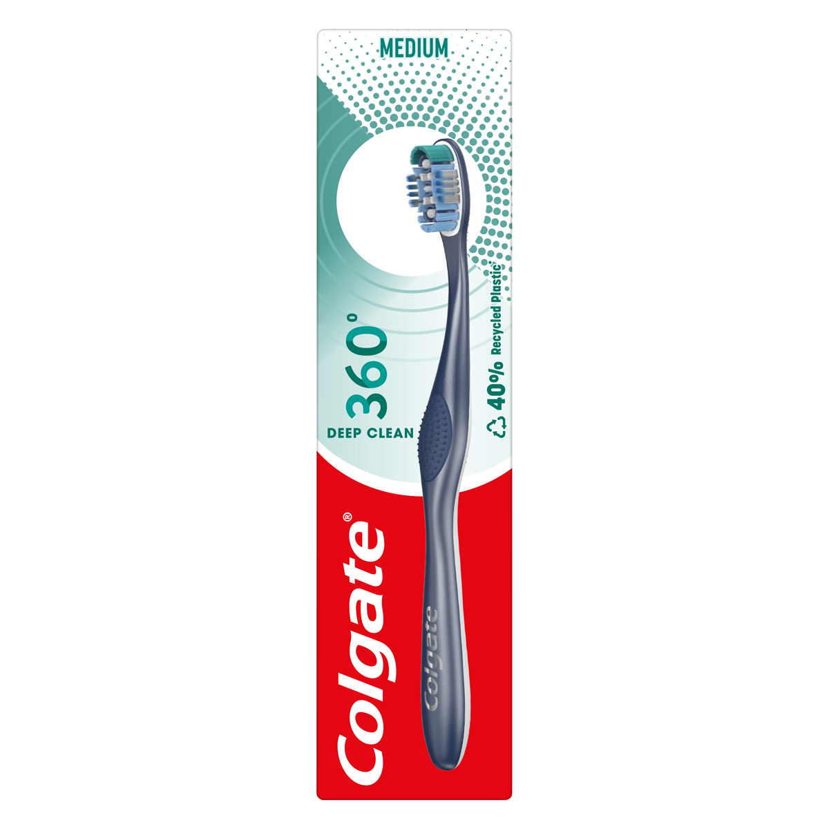 Η μέτρια οδοντόβουρτσα Colgate 360 Deep Clean καθαρίζει σχολαστικά αφαιρώντας βακτήρια από τα δόντια, τη γλώσσα, τα μάγουλα και τα ούλα σας. Είναι επίσης σχεδιασμένη με μεσοδόντιους θυσσάνους για να καθαρίζει ανάμεσα στα δόντια.