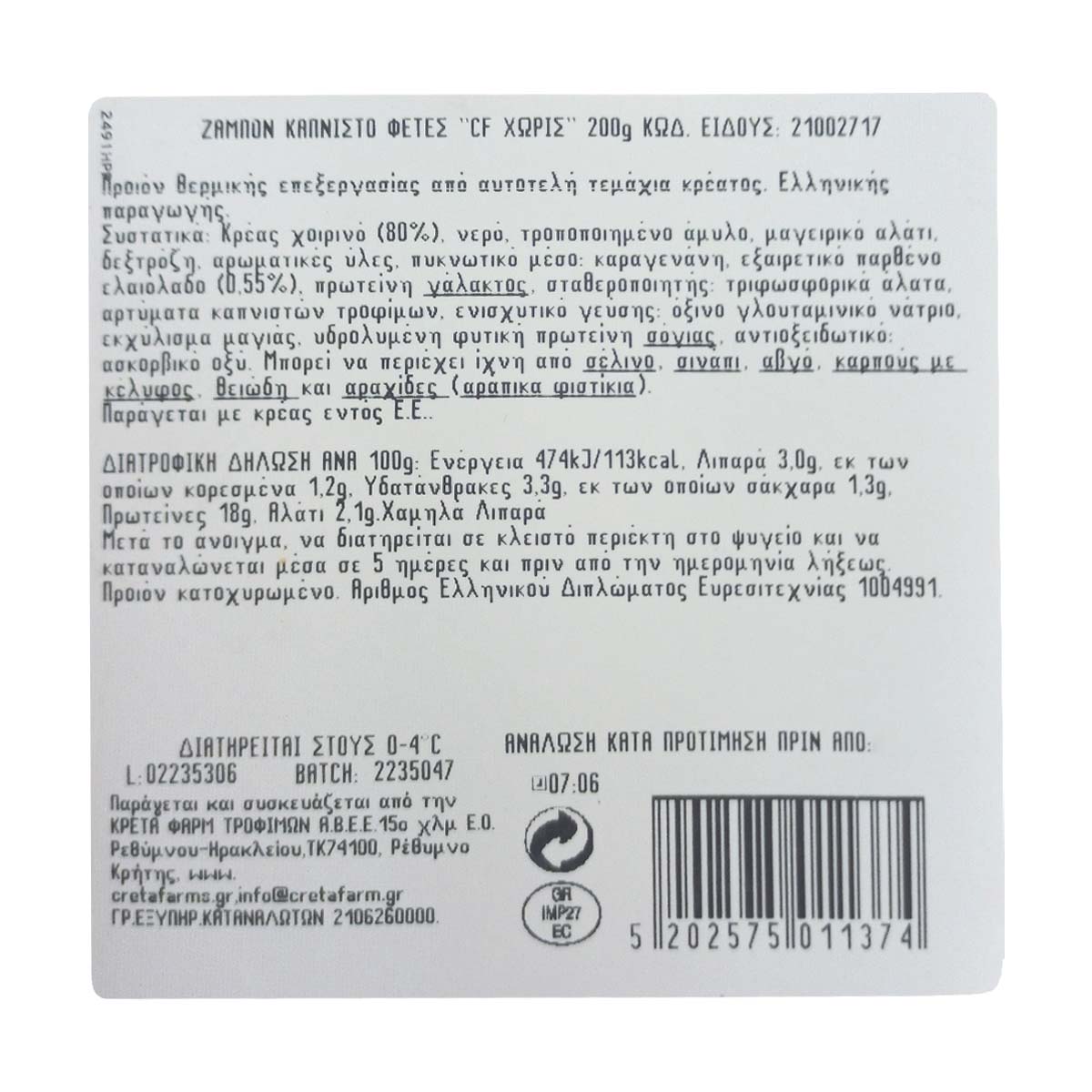 Creta Farms "Χωρίς" Ζαμπόν Καπνιστό Σε Φέτες 0-3% Χωρίς Γλουτένη 200 gr