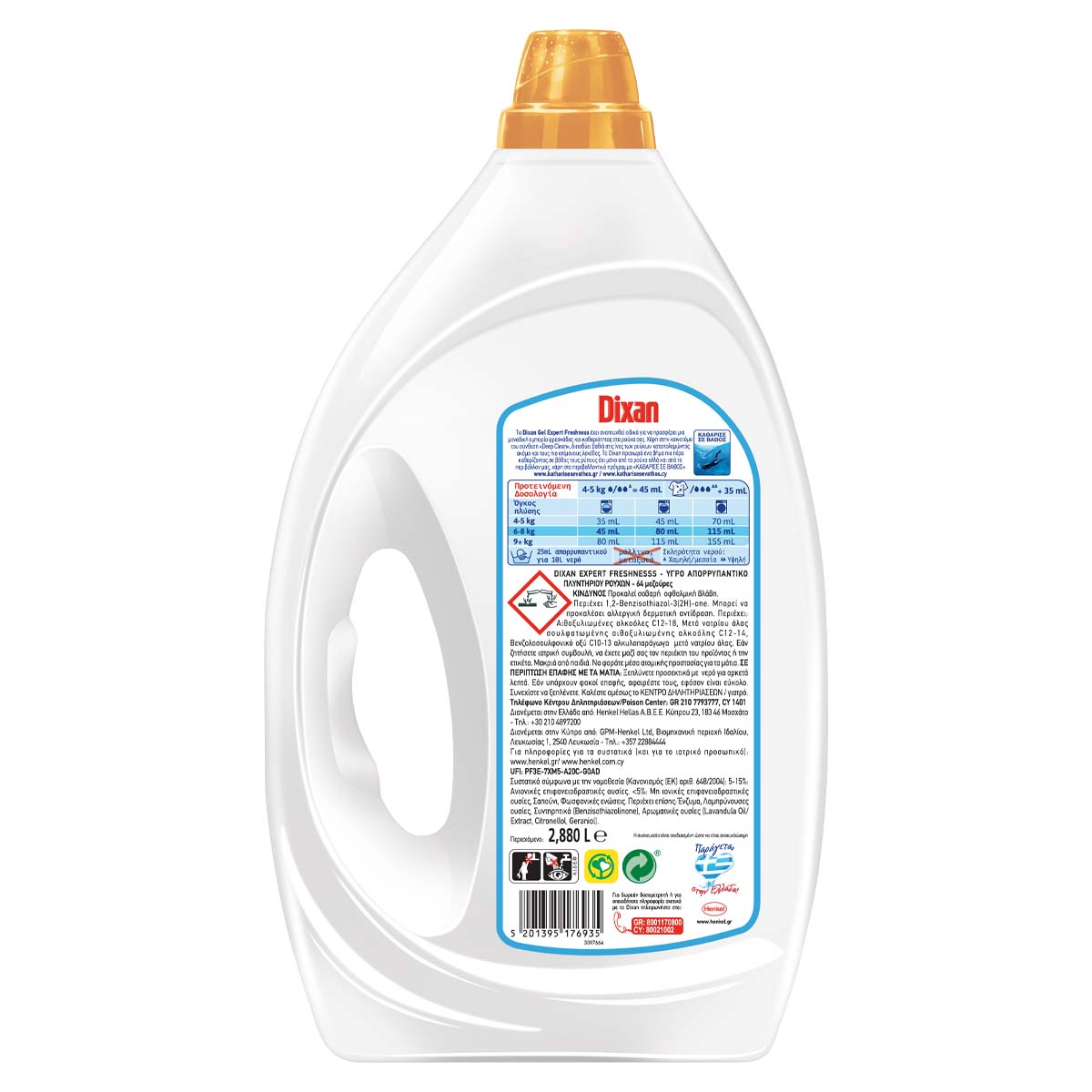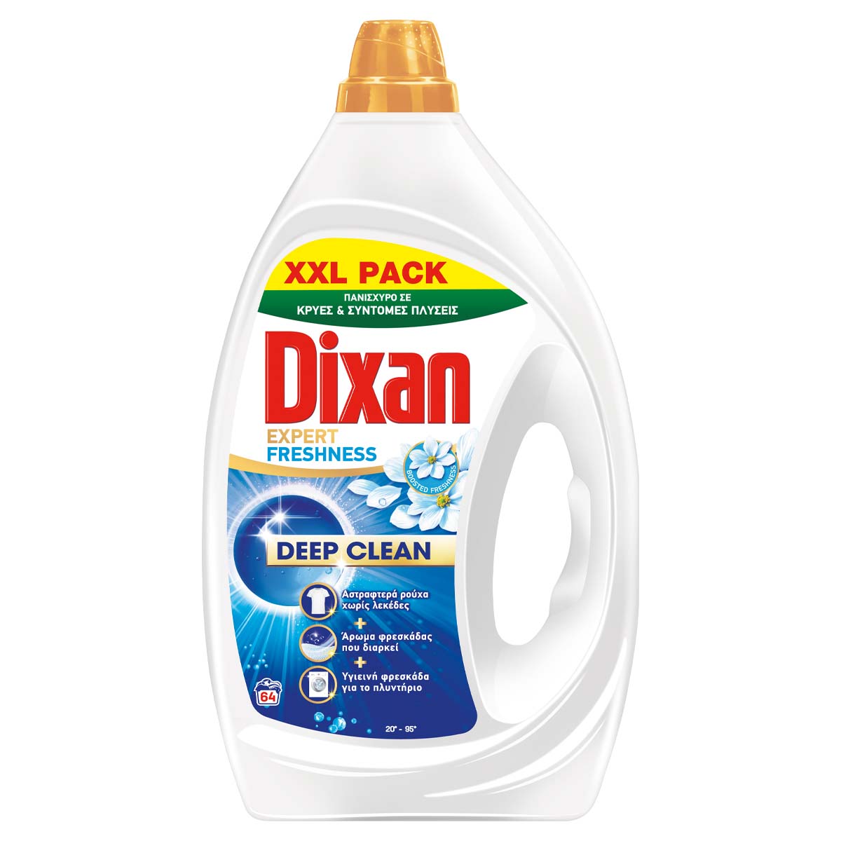 Το Dixan Gel Expert Freshness, έχει αναπτυχθεί ειδικά για να προσφέρει μια μοναδική εμπειρία καθαριότητας και ενισχυμένης φρεσκάδας που διαρκεί. Χάρη στην καινοτόμο του σύνθεση Deep Clean προσφέρει καθαριότητα σε βάθος τόσο στα ρούχα όσο και στο πλυντήριο. Υγιεινή Φρεσκάδα και για το Πλυντήριο: Το Dixan διεισδύει σε βάθος και στο πλυντήριο, εξουδετερώνοντας τα υπολείμματα που προκαλούν δυσάρεστες οσμές, προσφέροντας του υγιεινή φρεσκάδα για ακόμη καλύτερα αποτελέσματα σε κάθε πλύση. Το Dixan προχωρά ένα βήμα πιο πέρα καθαρίζοντας σε βάθος τους ρύπους όχι μόνο από τα ρούχα αλλά και από το περιβάλλον μας, χάρη στο περιβαλλοντικό πρόγραμμα ΚΑΘΑΡΙΣΕ ΣΕ ΒΑΘΟΣ, ΚΑΘΑΡΙΣΕ ΣΤΗ ΠΗΓΗ ενώ η συσκευασία του είναι σχεδιασμένη ώστε να είναι 100% ανακυκλώσιμη. Πανίσχυρο σε Κρύες & Σύντομες Πλύσεις: Με το Dixan μπορείτε να εξοικονομείτε ενέργεια σε κάθε πλύση, αλλά και να συνεισφέρετε στην μείωση του περιβαλλοντικού αποτυπώματος, χάρη στην πανίσχυρη φούρμουλά του - αποτελεσματική από του 20°C.