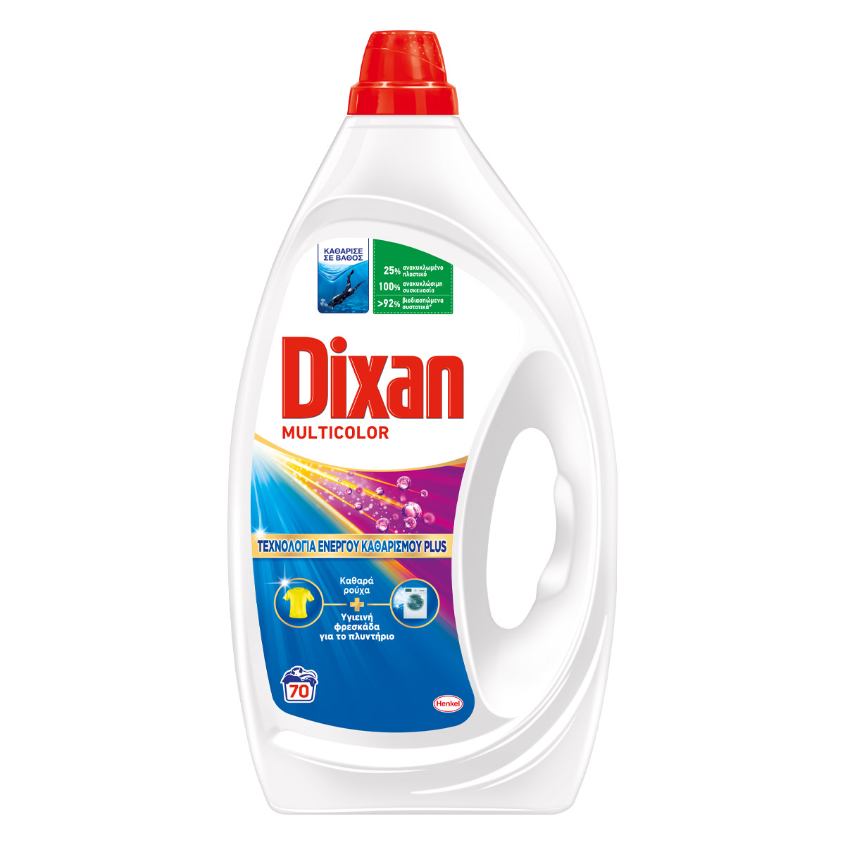 Το Dixan Υγρό Απορρυπαντικό Πλυντηρίου Ρούχων με τεχνολογία Ενεργού Καθαρισμού PLUS, είναι αποτελεσματικό ακόμα και με τους πιο επίμονους λεκέδες. Η νέα του σύνθεση εισχωρεί βαθιά στις ίνες των ρούχων, αφαιρώντας και τα πιο μικρά σωματίδια ρύπων, ενώ παράλληλα προστατεύει τα ρούχα σας από την δημιουργία κόμπων. Το Dixan προχωρά ένα βήμα πιο πέρα καθαρίζοντας σε βάθος τους ρύπους όχι μόνο από τα ρούχα μας αλλά και από τις θάλασσές μας, χάρη στο περιβαλλοντικό του πρόγραμμα "ΚΑΘΑΡΙΣΕ ΣΕ ΒΑΘΟΣ". Μάθετε περισσότερα στο: katharisesevathos.gr.