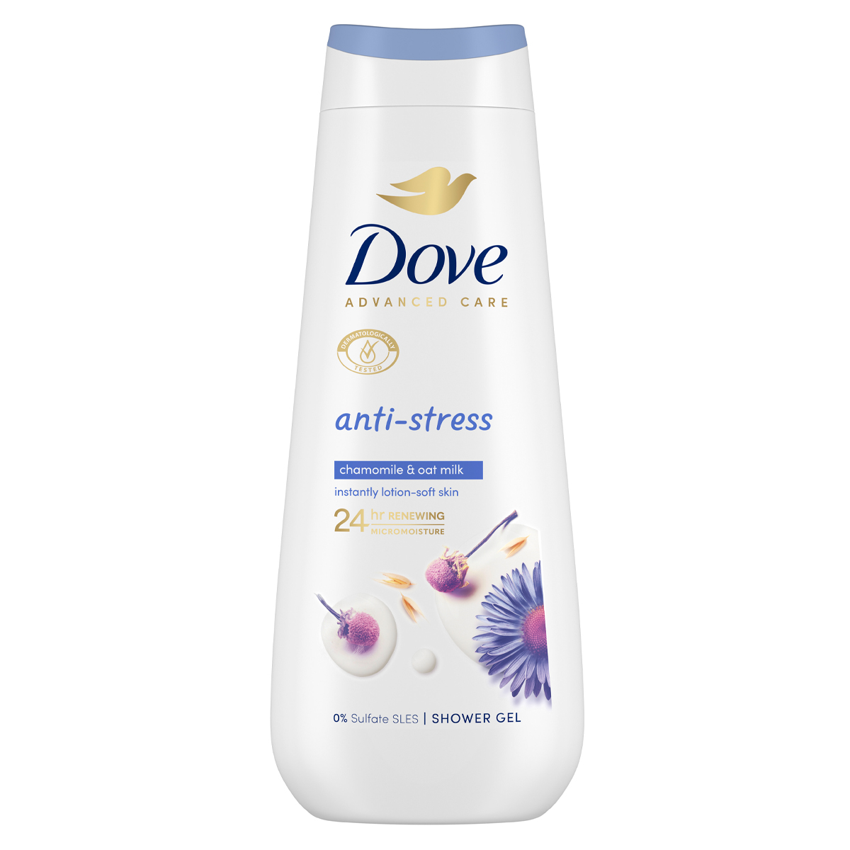 Το αφρόλουτρο Dove Advanced Care Anti-Stress με χαμομήλι και γάλα βρώμης, θρέφει ακόμα και το πιο ξηρό δέρμα σε ένα μόνο ντους. Νιώστε την επιδερμίδα σας απαλή και ενυδατωμένη για 24 ώρες.