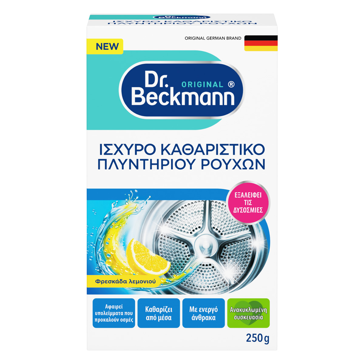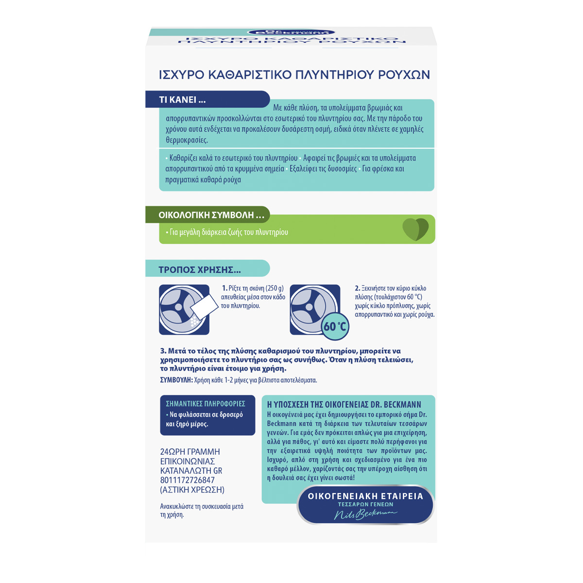 Το Καθαριστικό Πλυντηρίου Ρούχων Dr.Beckmann διατηρεί το σύστημα του πλυντηρίου σας καθαρό, υγιεινό χωρίς δυσάρεστες οσμές, ενώ απομακρύνει τα άλατα, αποτρέπει την οξείδωση των μετάλλων, καθαρίζει το τύμπανο την θήκη απορρυπαντικού τα πλαστικά μέρη, πόρτες και λάστιχα. Διασπά το στρώμα της βρωμιάς, καταπολεμά τους μικροοργανισμούς και συμβάλλει στην αποτροπή των βλαβών.