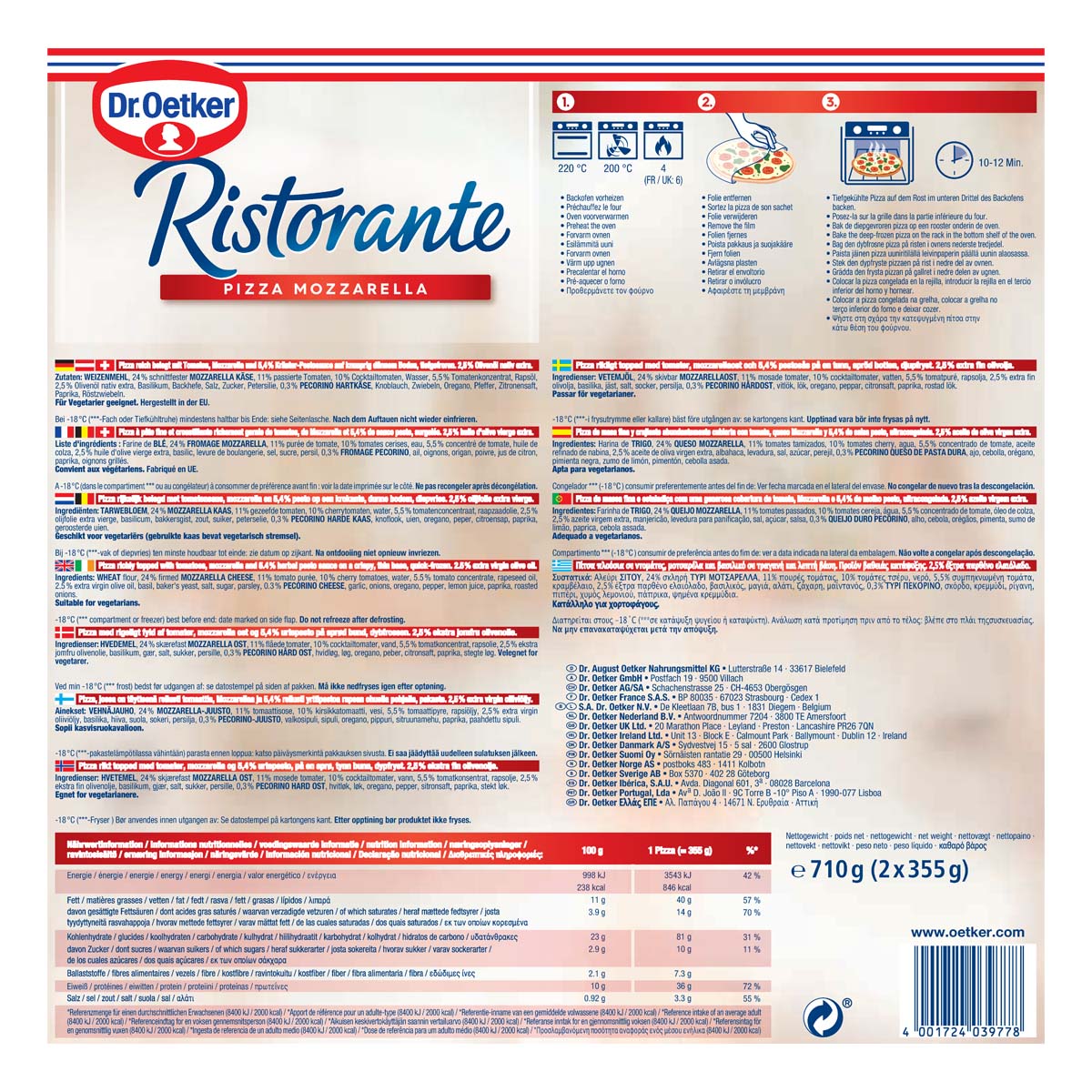 Η τραγανή και λεπτή ζύμη και η πλούσια επίστρωση από νόστιμα καλοδιαλεγμένα υλικά κάνουν την πίτσα Dr. Oetker Ristorante Mozzarella ακαταμάχητη για τους λάτρεις της ιταλικής πιτσαρίας. H πίτσα Dr. Oetker Ristorante Mozzarella περιέχει σάλτσα τομάτας, μοτσαρέλα, τυρί ένταμ και ένα συναρπαστικό μίγμα μπαχαρικών και βοτάνων.