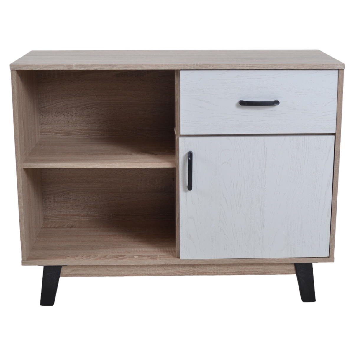 Ντουλάπι ξύλινο σε φυσικό χρώμα με ράφι, άσπρο πορτάκι και συρτάρι, κομψά πόδια και χερούλι για εύκολη χρήση σε μαύρο χρώμα. Είναι λειτουργικό με μοντέρνο σχεδιασμό και διαχρονικό στυλ.