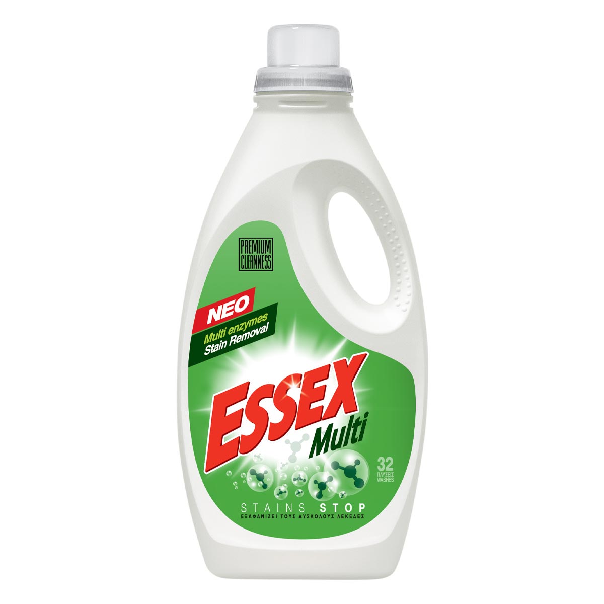 Με την εξελιγμένη σύνθεση πολλαπλών ενζύμων και ενεργού οξυγόνου, το Νέο Essex Touch καταπολεμά όλους τους καθημερινούς, επίμονους λεκέδες. Χάρη στη «STAINS STOP» δραστική του σύνθεση, είναι η απόλυτη λύση καθαριότητας, φρεσκάδας και οικονομίας.