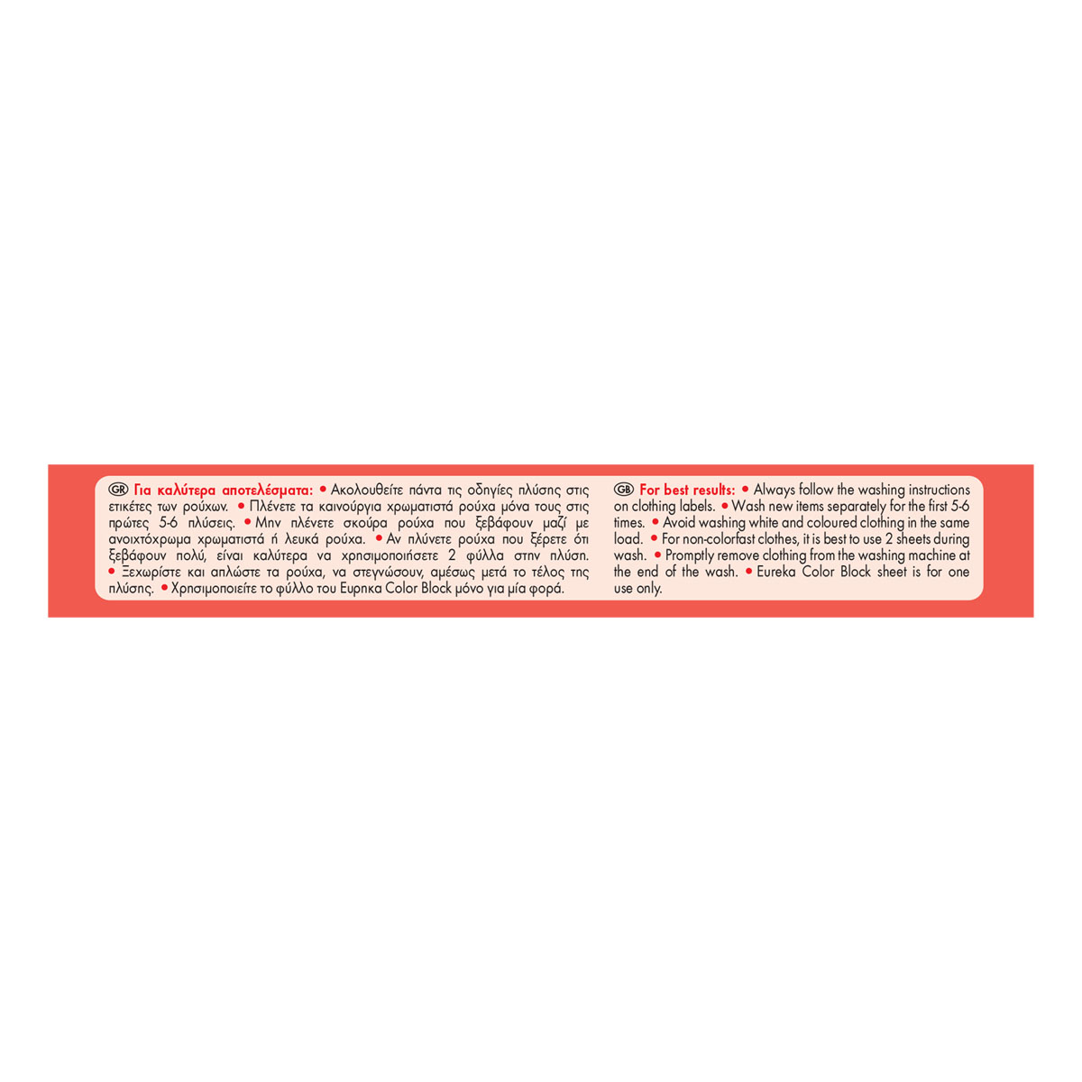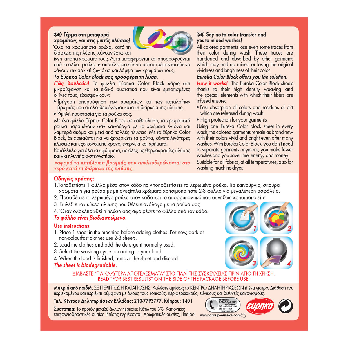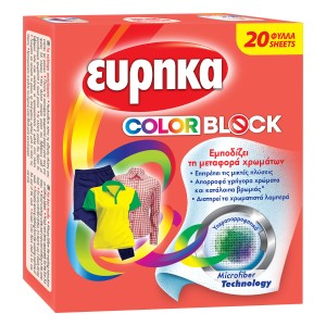 Xάρη στη μικροΰφανση και τα ειδικά συστατικά με τα οποία είναι εμποτισμένες οι ίνες τους, τα φύλλα Εύρηκα Color Block απορροφούν γρήγορα τα χρώματα και τις βρωμιές, που διαχέονται κατά τη διάρκεια της πλύσης, πριν μεταφερθούν σε άλλα υφάσματα και τα καταστρέψουν. Με τα φύλλα Εύρηκα Color Block, σε κάθε πλύση, τα χρωματιστά ρούχα παραμένουν καινούργια με χρώματα έντονα και λαμπερά, ακόμα και μετά από πολλές πλύσεις! Επιπλέον, οι πλύσεις γίνονται λιγότερες, αφού δεν χρειάζεται να ξεχωρίζονται τα ρούχα, κι έτσι επιτυγχάνεται εξοικονόμηση χρόνου, ενέργειας αλλά και οικονομία!