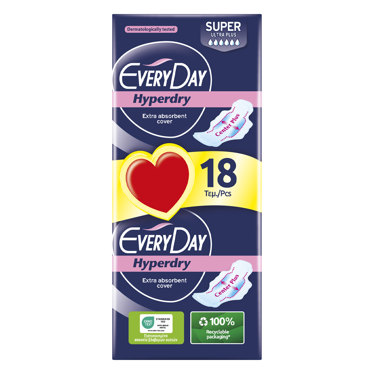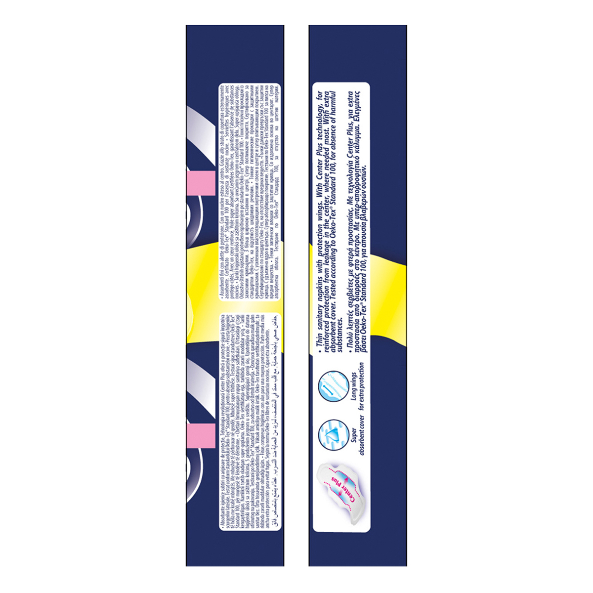 Μεγάλου μήκους λεπτές σερβιέτες, με φτερά προστασίας. Με την επαναστατική τεχνολογία Center Plus, με διευρυμένο πυρήνα, που εξασφαλίζει έως και 30% μεγαλύτερη απορροφητική επιφάνεια στο κέντρο της σερβιέτας, σε σχέση με άλλες λεπτές σερβιέτες, για απίστευτη προστασία από διαρροές, εκεί που χρειάζεται περισσότερο. Με υπερ-απορροφητικό κάλυμμα. Δερματολογικά ελεγμένες.