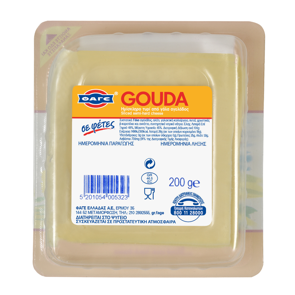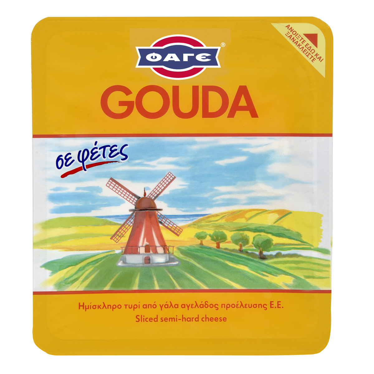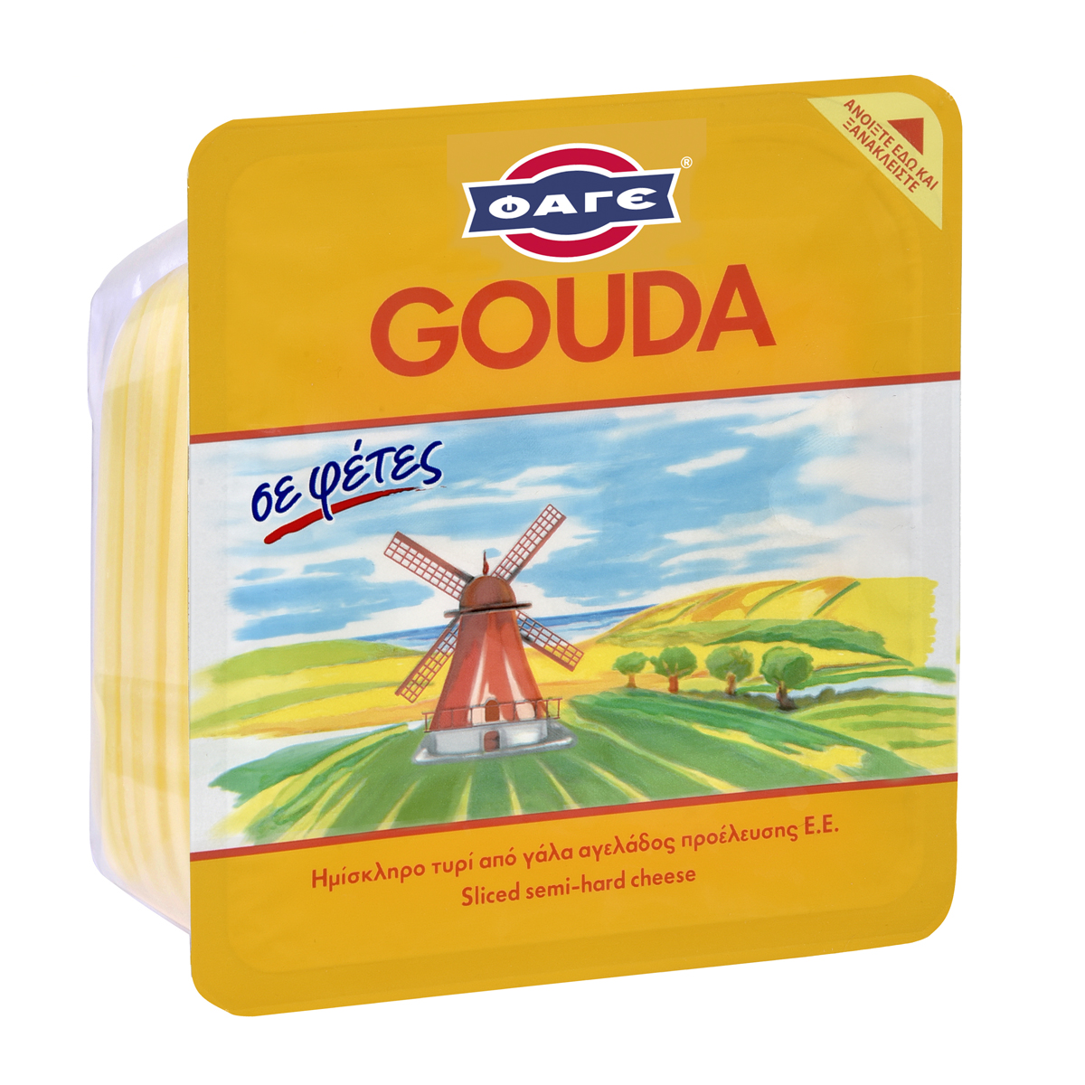 Ημίσκληρο εύγευστο τυρί, το Gouda έχει την ίδια καλή υφή, ζεστό ή κρύο.Λιώνει όμορφα στις πίτσες και στα τοστ!