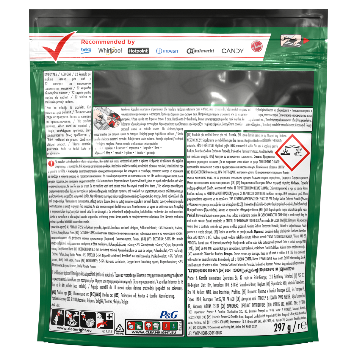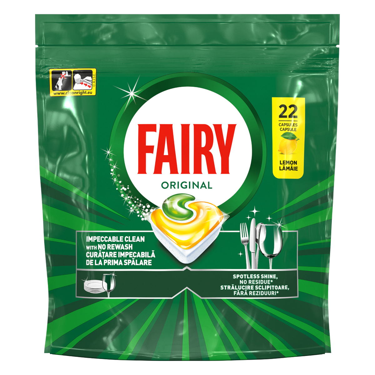 Ζήστε την αξεπέραστη καθαριότητα χωρίς επαναληπτική πλύση και την αποτελεσματική δράση στο 100% των λιπών με τις κάψουλες πλυντηρίου πιάτων Fairy Original All-in-One – τη λύση σας για λαμπερά, πεντακάθαρα πιάτα με την 1η. Έχουν σχεδιαστεί για να είναι αποτελεσματικές στο 100% των λιπών, αντιμετωπίζοντας ακόμη και τα ξεραμένα λίπη. Σαν το υγρό πιάτων Fairy, αλλά σε βολική μορφή κάψουλας. Το εξαιρετικά διαλυτό περίβλημα της κάψουλας διαλύεται γρήγορα, ξεκινώντας άμεσα το πλύσιμο για ισχυρή καθαριότητα. Οι κάψουλες συνδυάζουν υγρό και σκόνη, προσφέροντας εξαιρετική καθαριότητα με εύκολη χρήση. Λαμπερή καθαριότητα και ένα πλυντήριο πιάτων που μυρίζει φρεσκάδα. Η χρήση τους είναι εξαιρετικά εύκολη – προσφέρουν ενσωματωμένη δράση αλατιού και λαμπρυντικού πλυντηρίου πιάτων. Τοποθετήστε την κάψουλα στην ειδική θήκη και κλείστε. Πιάστε την κάψουλα μόνο με στεγνά χέρια. Μην αφαιρείτε το περιτύλιγμα και μην διαχωρίζετε ενωμένες κάψουλες. Σφραγίζετε τη σακούλα μετά από κάθε χρήση.