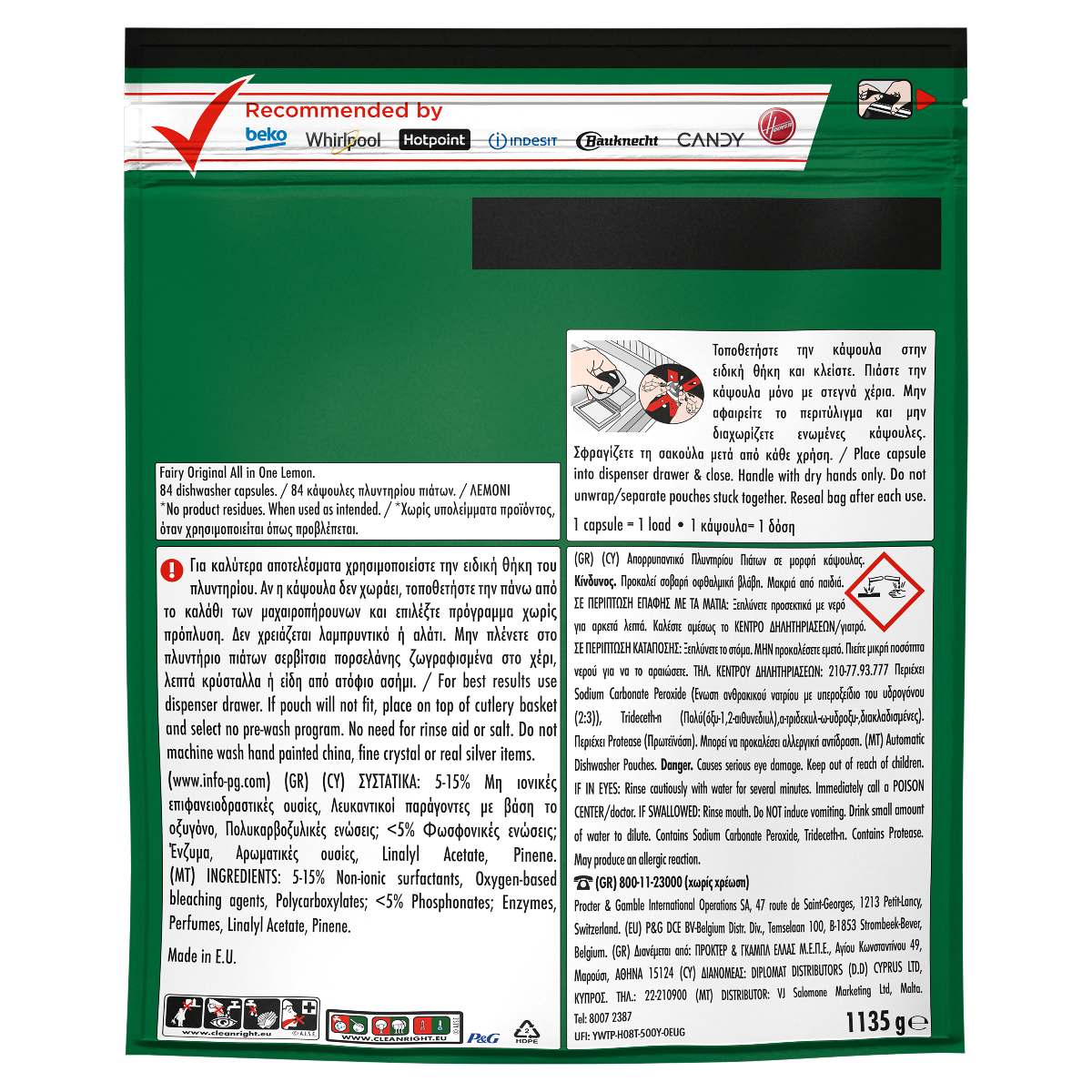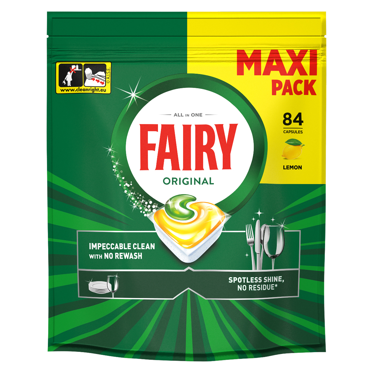 Ζήστε την αξεπέραστη καθαριότητα χωρίς επαναληπτική πλύση και την αποτελεσματική δράση στο 100% των λιπών με τις κάψουλες πλυντηρίου πιάτων Fairy Original All-in-One – τη λύση σας για λαμπερά, πεντακάθαρα πιάτα με την 1η. Έχουν σχεδιαστεί για να είναι αποτελεσματικές στο 100% των λιπών, αντιμετωπίζοντας ακόμη και τα ξεραμένα λίπη. Σαν το υγρό πιάτων Fairy, αλλά σε βολική μορφή κάψουλας. Το εξαιρετικά διαλυτό περίβλημα της κάψουλας διαλύεται γρήγορα, ξεκινώντας άμεσα το πλύσιμο για ισχυρή καθαριότητα. Οι κάψουλες συνδυάζουν υγρό και σκόνη, προσφέροντας εξαιρετική καθαριότητα με εύκολη χρήση. Λαμπερή καθαριότητα και ένα πλυντήριο πιάτων που μυρίζει φρεσκάδα. Η χρήση τους είναι εξαιρετικά εύκολη – προσφέρουν ενσωματωμένη δράση αλατιού και λαμπρυντικού πλυντηρίου πιάτων. Τοποθετήστε την κάψουλα στην ειδική θήκη και κλείστε. Πιάστε την κάψουλα μόνο με στεγνά χέρια. Μην αφαιρείτε το περιτύλιγμα και μην διαχωρίζετε ενωμένες κάψουλες. Σφραγίζετε τη σακούλα μετά από κάθε χρήση.