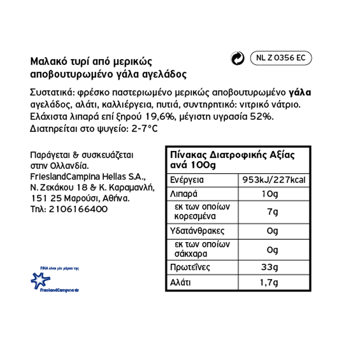 Το FINA είναι πλούσιο σε πρωτεΐνες και ασβέστιο και με μόνο 10% λιπαρά, το FINA περιέχει όλα τα απαραίτητα στοιχεία για την διατήρηση των μυικών ιστών του σώματος και ενός γερού σκελετού,διατηρώντας τη γεύση ενός κίτρινου τυριού. Επίσης, το FINA έχει χαμηλές θερμίδες και έχει υψηλή θέση στην διατροφική αξία.