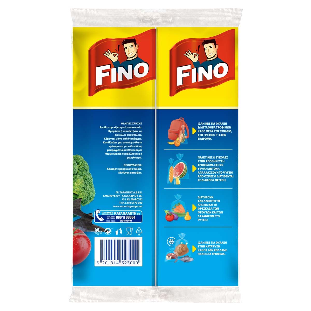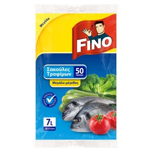 Σακούλες τροφίμων FINO ιδανικές για φύλαξη και μεταφορά τροφίμων. Η συσκευασία περιέχει 50 σακούλες τροφίμων μεγάλου μεγέθους (7L) 28x43cm.