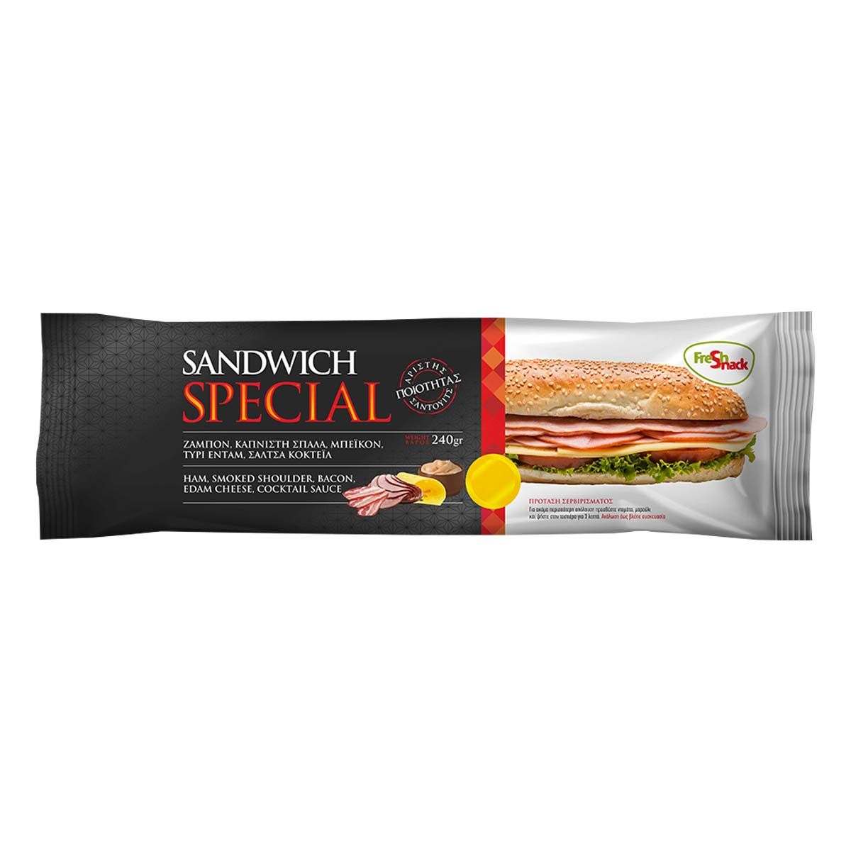 Τυρί Edam, ζαμπόν, σπάλα καπνιστή, μπέικον, σάλτσα κοκτέιλ.