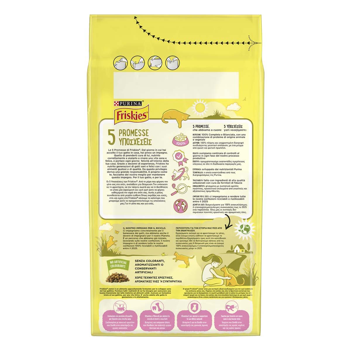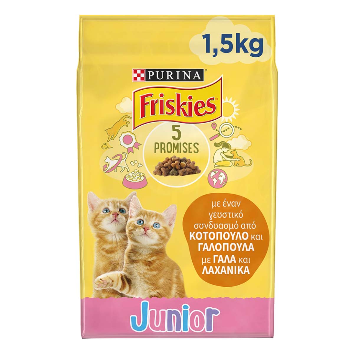 Ξηρή Τροφή Γάτας. Τα γατάκια είναι εξερευνητές από τη φύση τους, αντιλαμβάνονται τα πάντα στο περιβάλλον τους. Καταναλώνουν πολλή ενέργεια σε νέες περιπέτειες κάθε μέρα, κι επομένως έχουν συγκεκριμένες σωματικές ανάγκες. Γι' αυτό οι ειδικοί της Purina® έχουν δημιουργήσει τα Friskies® Junior: νόστιμη ποιοτική τροφή για γάτες, προσεκτικά ισορροπημένη για να ανταποκρίνεται στις μοναδικές ανάγκες των γατιών για ένα υγιές, χαρούμενο ξεκίνημα σε μια περιπετειώδη ζωή γεμάτα ζωντάνια. Τα Friskies® διατρέφουν γάτες με σωστή, υγιεινή τροφή για δεκαετίες. Γεμίζουμε χιλιάδες μπωλ και αυτή η τιμή συνοδεύεται από τεράστια ευθύνη. Γι' αυτό οι συνταγές Friskies® παρασκευάζονται χωρίς πρόσθετες τεχνητές χρωστικές, αρωματικές ύλες ή συντηρητικά. Για να μπορείτε να συνεχίσετε να τις διατρέφετε με την ίδια νόστιμη τροφή που αγαπούν και να νιώθετε περήφανοι γι' αυτό.