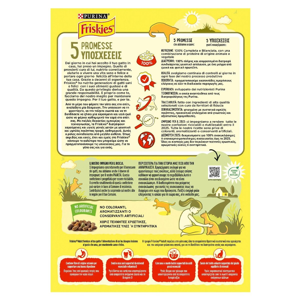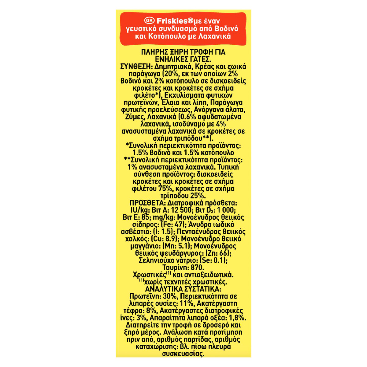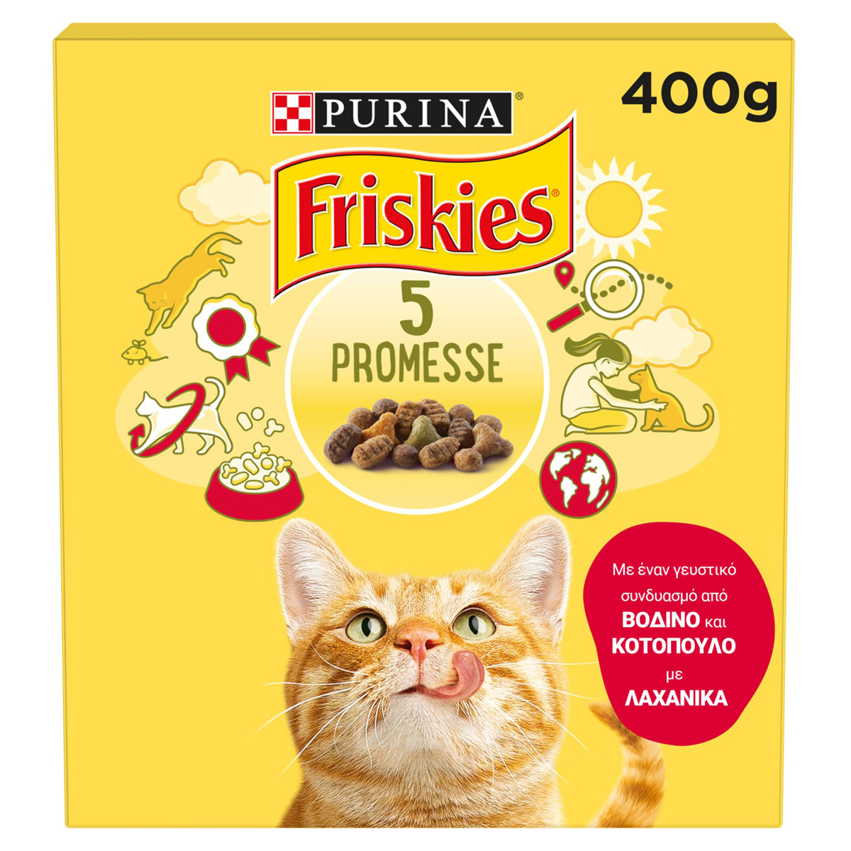 Ξηρή Τροφή Γάτας Friskies Βοδινό και Κοτόπουλο με Λαχανικά 400g. Οι γάτες είναι εξερευνητές από τη φύση τους, αντιλαμβάνονται τα πάντα στο περιβάλλον τους. Αυτό είναι που τις κάνει τόσο γοητευτικά και ενεργά μέλη της οικογένειας. Γι' αυτό οι ειδικοί της Purina® έχουν δημιουργήσει τα Friskies® για ενήλικες γάτες: νόστιμη, ποιοτική τροφή για γάτες, που θρέφει το αστείρευτο ενδιαφέρον του εξερευνητή σας για τον κόσμο. Χωρίς Πρόσθετες Τεχνητές Χρωστικές, Αρωματικές ύλες ή Συντηρητικά. Τα Friskies® διατρέφουν γάτες με σωστή, υγιεινή τροφή για δεκαετίες. Γεμίζουμε χιλιάδες μπωλ και αυτή η τιμή συνοδεύεται από τεράστια ευθύνη. Γι' αυτό οι συνταγές Friskies® παρασκευάζονται χωρίς πρόσθετες τεχνητές χρωστικές, αρωματικές ύλες ή συντηρητικά. Για να μπορείτε να συνεχίσετε να τις διατρέφετε με την ίδια νόστιμη τροφή που αγαπούν και να νιώθετε περήφανοι γι' αυτό.