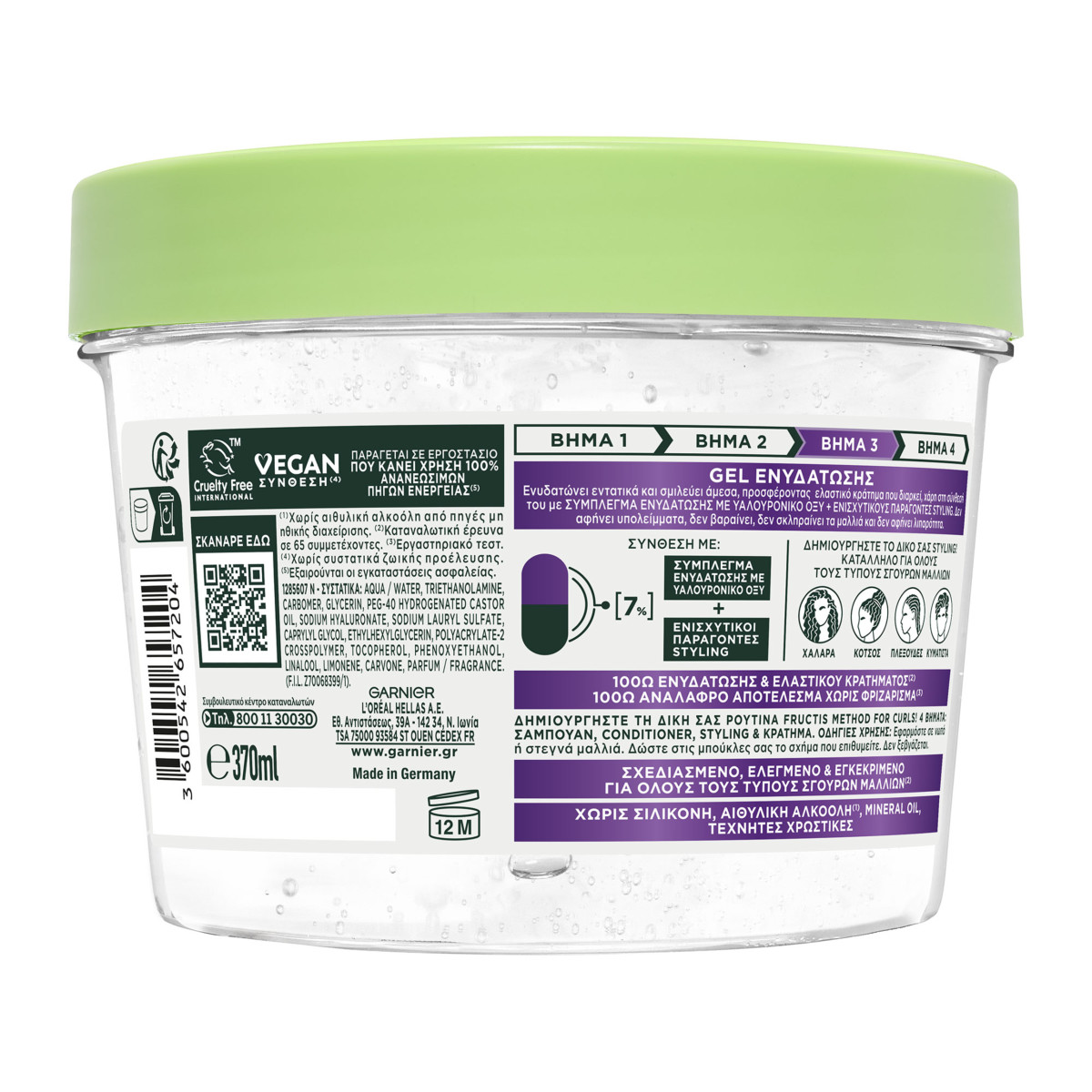 Hair Fact: Τα σγουρά μαλλιά, λόγω της εύθραυστης δομής τους, χάνουν υγρασία σε κάθε τους κίνηση. Το Νέο Garnier Fructis Method For Curls Flexi Hold - 3o Βήμα Gel Ενυδάτωσης, ενυδατώνει εντατικά και δίνει σχήμα στις μπούκλες σου με ελαστικό κράτημα που διαρκεί. Εμπλουτισμένο με: [7%] ΣΥΜΠΛΕΓΜΑ ΕΝΥΔΑΤΩΣΗΣ ΜΕ ΥΑΛΟΥΡΟΝΙΚΟ ΟΞΥ, ΥΓΡΟΣ ΠΑΡΑΓΟΝΤΑΣ STYLING. Σύνθεση χωρίς αιθυλική αλκοόλη (1). ΑΠΟΤΕΛΕΣΜΑ: Ορατή μεταμόρφωση. Ενυδατωμένες μπούκλες με ελαστικό σχήμα. Το ελαστικό κράτημα επιτρέπει φυσική κίνηση και όγκο χωρίς να βαραίνει τα μαλλιά. 100 ώρες ανάλαφρο αποτέλεσμα, χωρίς φριζάρισμα (3). Δεν αφήνει υπολείμματα, δεν σκληραίνει τα μαλλιά, δεν αφήνει λιπαρότητα. 100 ΩΡΕΣ ΕΝΥΔΑΤΩΣΗΣ & ΕΛΑΣΤΙΚΟΥ ΚΡΑΤΗΜΑΤΟς (2) 100 ΩΡΕΣ ΑΝΑΛΑΦΡΟ ΑΠΟΤΕΛΕΣΜΑ ΧΩΡΙΣ ΦΡΙΖΑΡΙΣΜΑ (3) ΔΗΜΙΟΥΡΓΗΣΕ ΤΗ ΔΙΚΗ ΣΟΥ ΡΟΥΤΙΝΑ METHOD FOR CURLS!