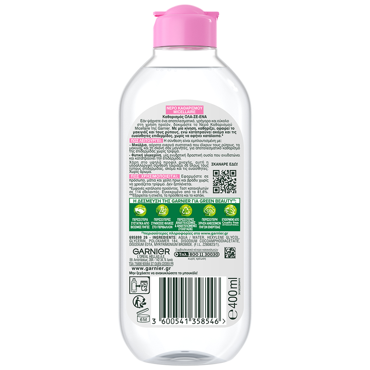 Με μια κίνηση καθαρίζει, απομακρύνει το μακιγιάζ και τους ρύπους ενώ καταπραΰνει όλους τους τύπους επιδερμίδας, ακόμα και τις ευαίσθητες επιδερμίδες. Ιδανικό για πρόσωπο, μάτια και χείλη. Δερματολογικά και οφθαλμολογικά ελεγμένη σύνθεση. Η σύνθεση του είναι εμπλουτισμένη με ένα βιοτεχνολογικό συστατικό: Μικύλλια, αόρατα ενεργά συστατικά που απομακρύνουν το μακιγιάζ και τους ρύπους σαν μαγνήτες, για αποτελεσματικό καθαρισμό της επιδερμίδας χωρίς τρίψιμο. Σε 1 πέρασμα καθαρίζει 10 τύπους ρύπων. Χάρη στην υποαλλεργική του σύνθεση, σέβεται κάθε τύπο επιδερμίδας, ακόμη και τις πιο ευαίσθητες. Χωρίς άρωμα, επίμονο τρίψιμο, ερεθισμούς, ξέβγαλμα & κατάλοιπα.