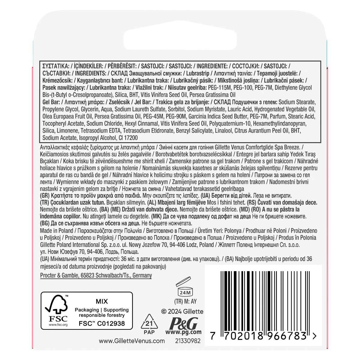 Οι ανταλλακτικές κεφαλές της γυναικείας ξυριστικής μηχανής Gillette Venus ComfortGlide Spa Breeze περιβάλλονται από λιπαντικές μπάρες από gel που απελευθερώνουν μαλακτικές ουσίες με άρωμα λευκού τσαγιού, για καλύτερη ολίσθηση και απαλό ξύρισμα. Η κινούμενη & στρογγυλεμένη κεφαλή με 3 λεπίδες προσαρμόζεται στις καμπύλες του σώματός σας για άνετο ξύρισμα. Όλες οι ανταλλακτικές κεφαλές Gillette Venus ταιριάζουν με όλες τις λαβές ξυριστικών μηχανών Gillette Venus (εκτός από τη Gillette Simply Venus).