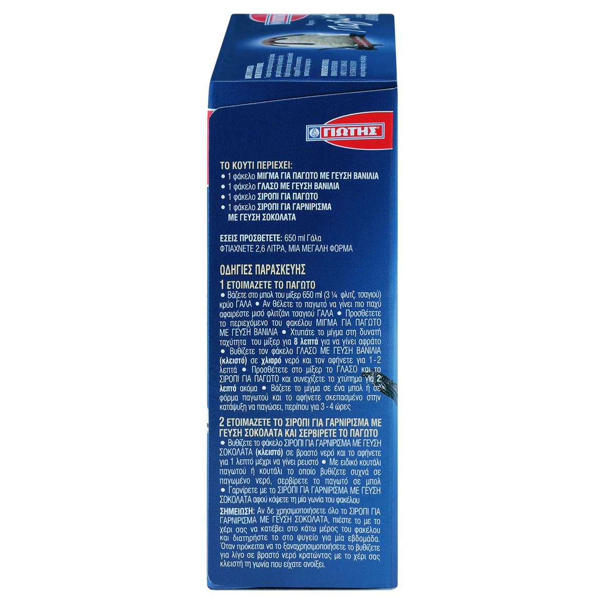 Μείγμα για σπιτικό παγωτό με αγνά υλικά και πλούσια γεύση, που παρασκευάζεται εύκολα και γρήγορα, με σίγουρη επιτυχία. Απλά χτυπήστε με κρύο γάλα και είναι έτοιμο. Πραγματικά απολαυστικό, αποτελεί μία πολύ γευστική και οικονομική λύση για όλη την οικογένεια.