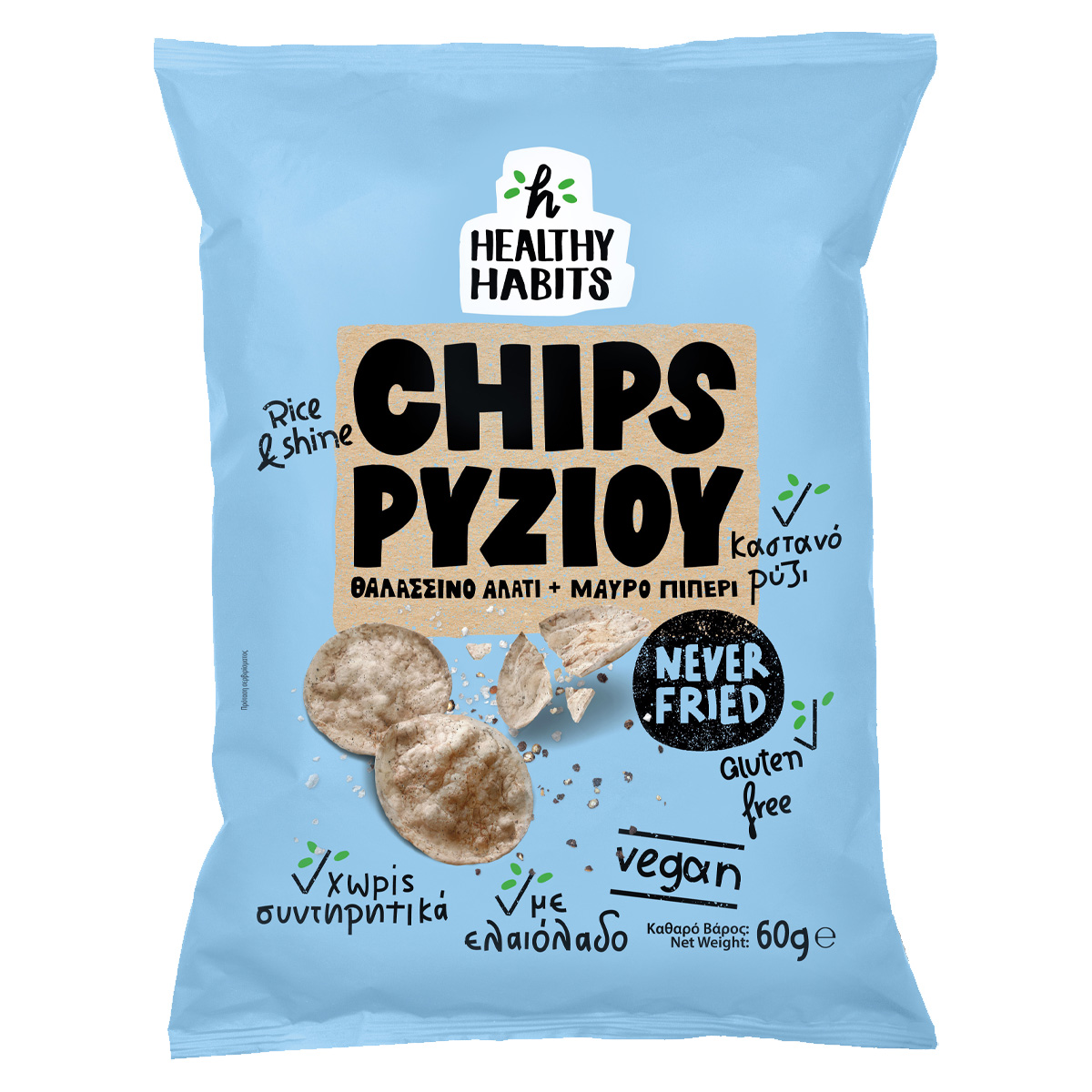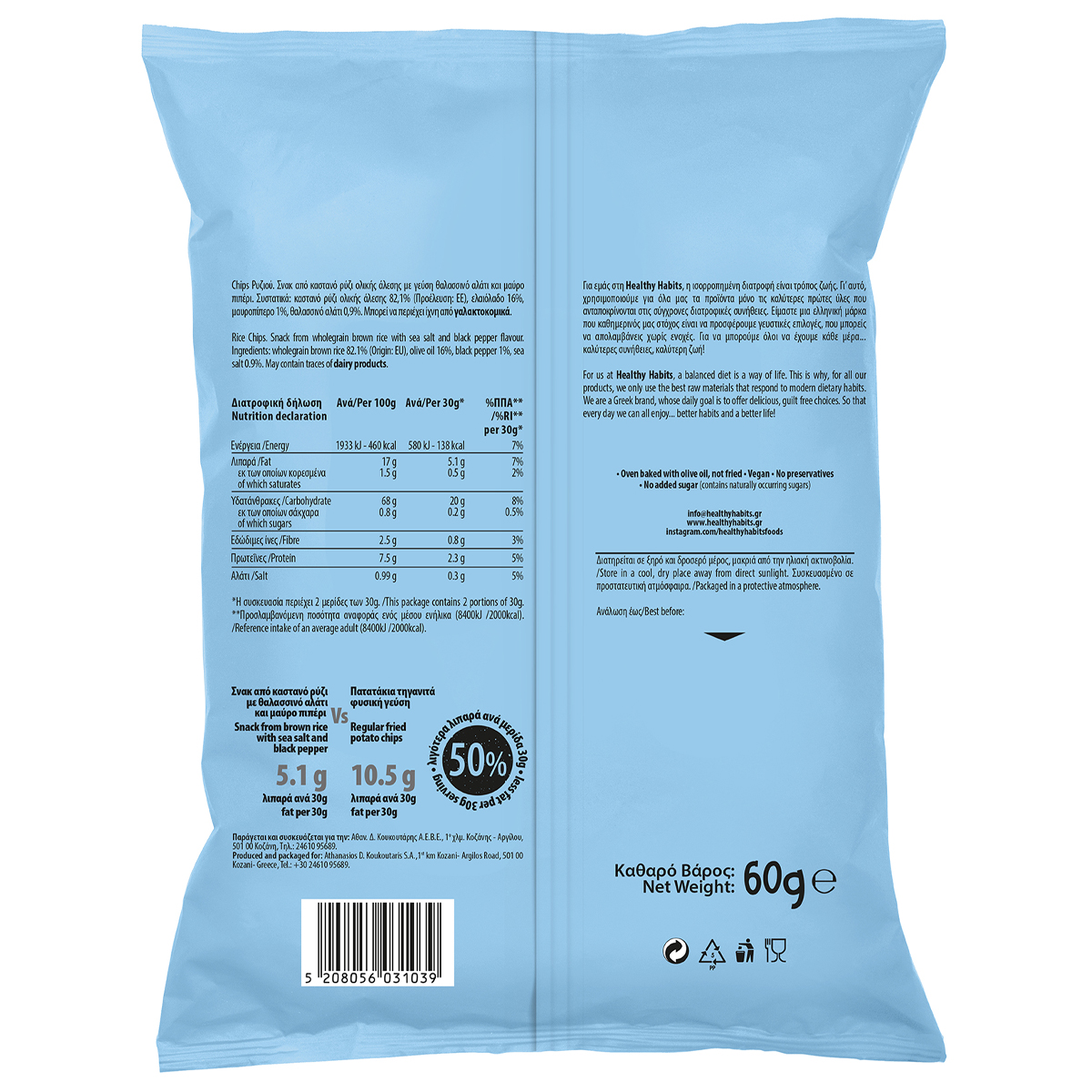 Τα popped chips ρυζιού με γεύση θαλασσινό αλάτι και μαύρο πιπέρι είναι τα πιο ακαταμάχητα αλλά και ταυτόχρονα healthy chips. Εξαιρετικά τραγανά, φτιαγμένα από καστανό ρύζι ολικής άλεσης που κάνει pop με το ελαιόλαδο, χαρίζοντάς τους τη μοναδική υφή τους. Χωρίς γλουτένη και συντηρητικά. Κατάλληλο και για vegan διατροφή. Η ιδανική λύση για ένα απολαυστικό snack στη δουλειά.