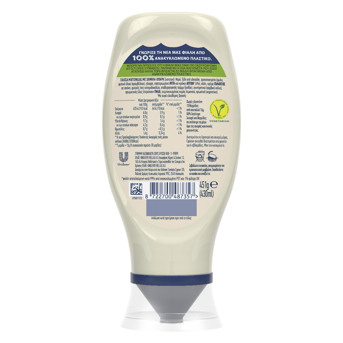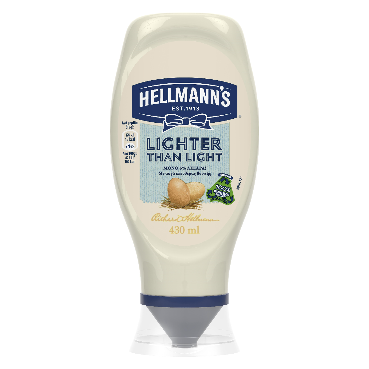 Tώρα όλη η απόλαυση μόνο με 15 θερμίδες ανά κουταλιά (15g)! Η Hellmann’s με μόνο 6% λιπαρά περιέχει μόνο 15 θερμίδες ανά κουταλιά (15g). Απολαύστε την σε πρωτοποριακό μπουκάλι Hellmann’s, όπου κάθε σταγόνα παραμένει υπέροχη όπως και η πρώτη! Το μοναδικό ΚΑΘΑΡΟ ΚΑΠΑΚΙ έχει σχεδιαστεί, ώστε να διατηρεί την πλούσια γεύση της Hellmann's μας αναλλοίωτη.