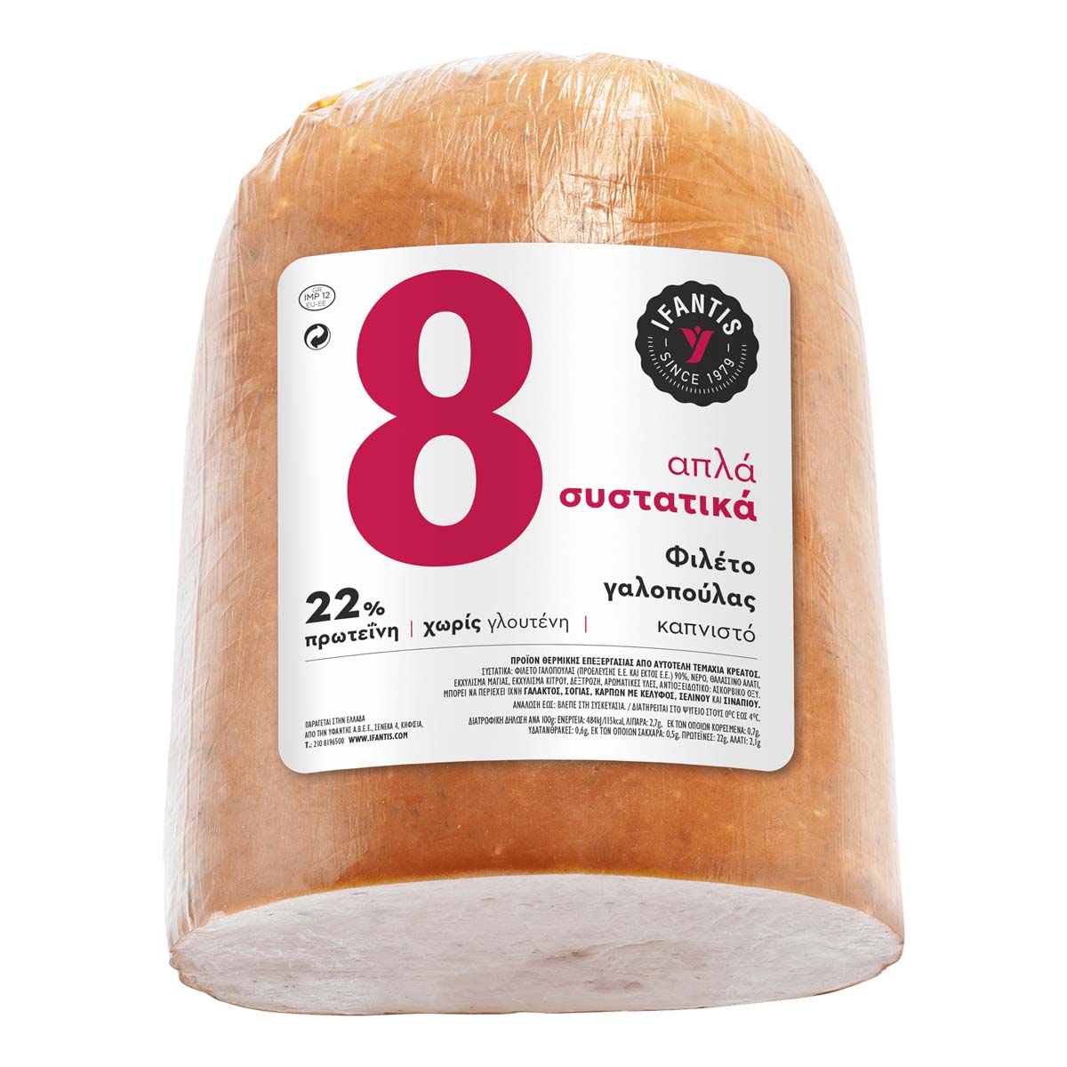 Η απολαυστική, πλούσια γεύση της καινοτομίας έχει μόνο 8 απλά συστατικά! Από ατόφια, ολόκληρα κομμάτια εκλεκτού φιλέτου καπνιστής γαλοπούλας 90%, με 22% πρωτεΐνη και χαμηλά λιπαρά.